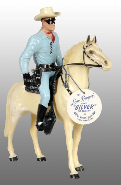 Description Plastic. Includes original string tag. Walking horse. Rider has minor overall wear and soiling. Both guns and hat are present. Horse has overall wear, soiling and minor damage. Saddle is present. Condition (Very Good). Size 9".