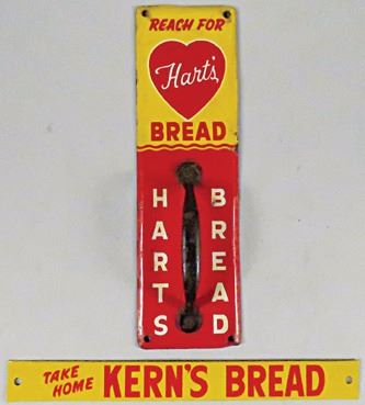 Harts Bread Door Pull and Kern's Bread Strip Sign. Kern's Sign, mint condition. Hart's door pull has some paint loss, measures 3 X 10 inches.