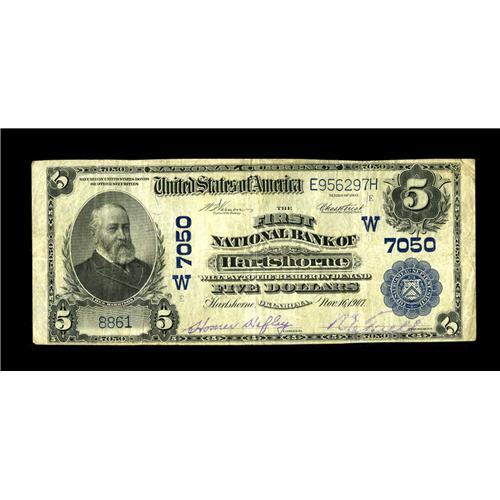 <B>Hartshorne, OK</B></I> - $5 1902 Plain Back Fr. 600 <B>The First NB</B></I> Ch. # (W)7050<BR>A very tough note from a bank which issued large notes only. Nine pieces are reported, with two of those Territorial Red Seals. This specimen, which grades a pleasing <B>Fine+++</B></I> with violet signatures, is as nice as any listed in the census from here.<BR><BR><b>Shipping:</b> Coin/Currency (<a target="_blank" href="http://www.heritageauctions.com/common/shipping.php">view shipping information</a>)