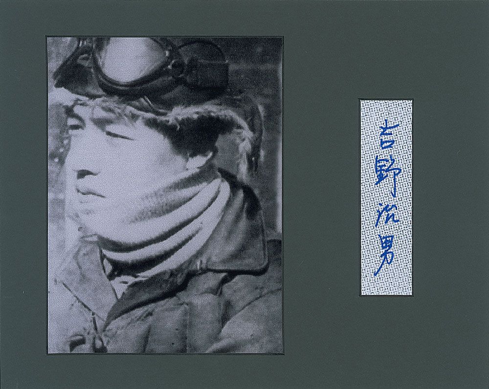 Japanese fighter pilot who flew off the Japanese Carrier Kaga during the Pearl Harbor attack, and was also involved in the Battle of Midway. Uncommon felt tip signature in Japanese on an off-white 1 x 4 slip. Matted with a photo of Yoshino in a plane to an overall size of 10 x 8. In fine condition.