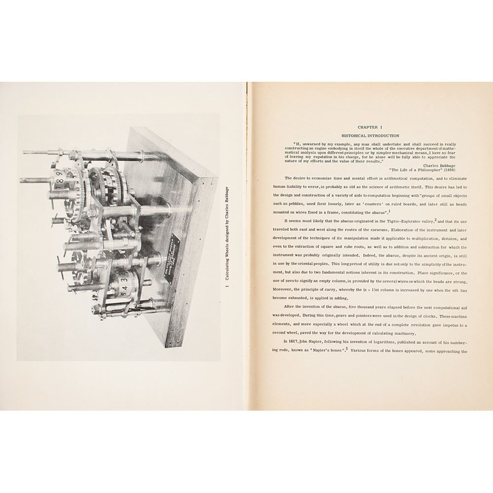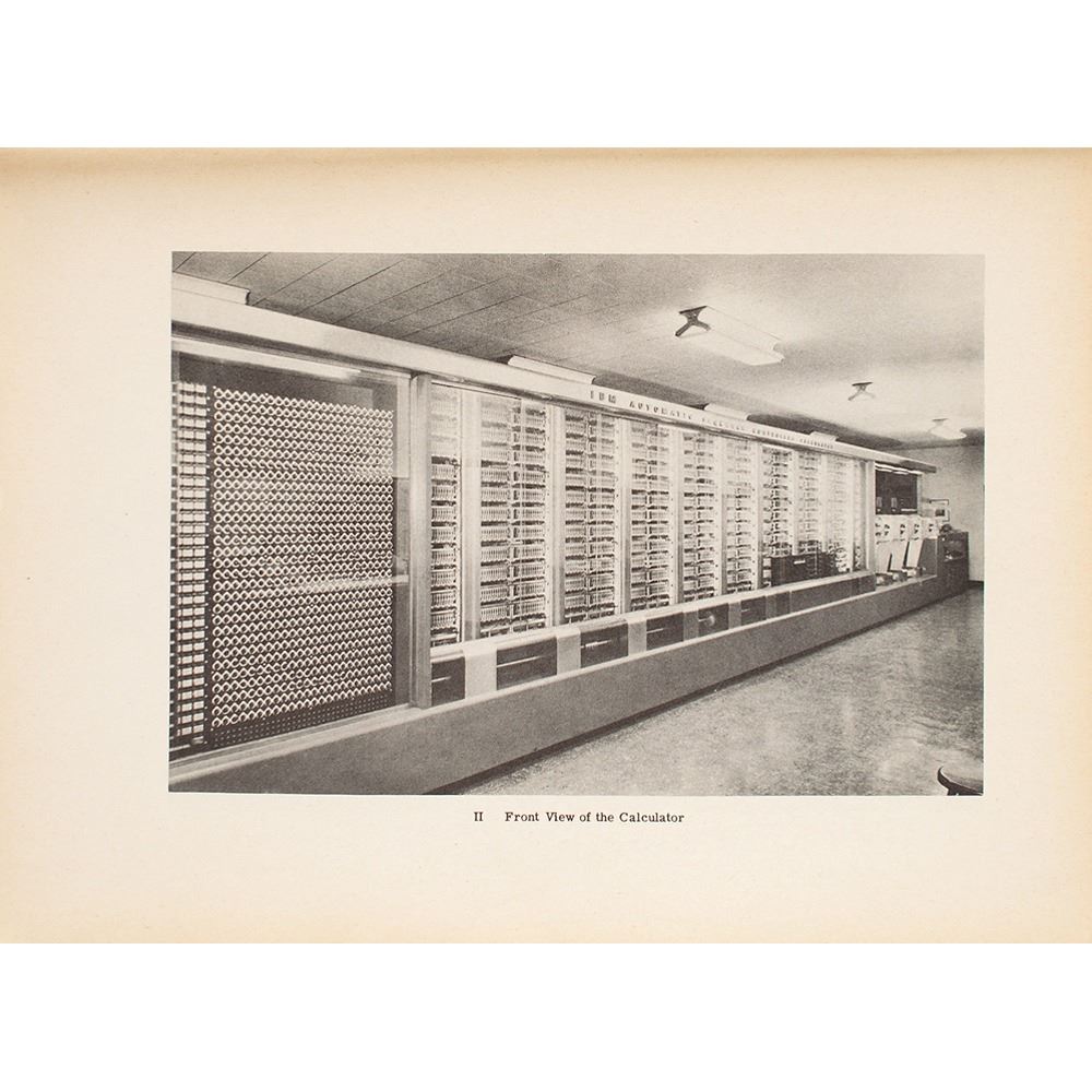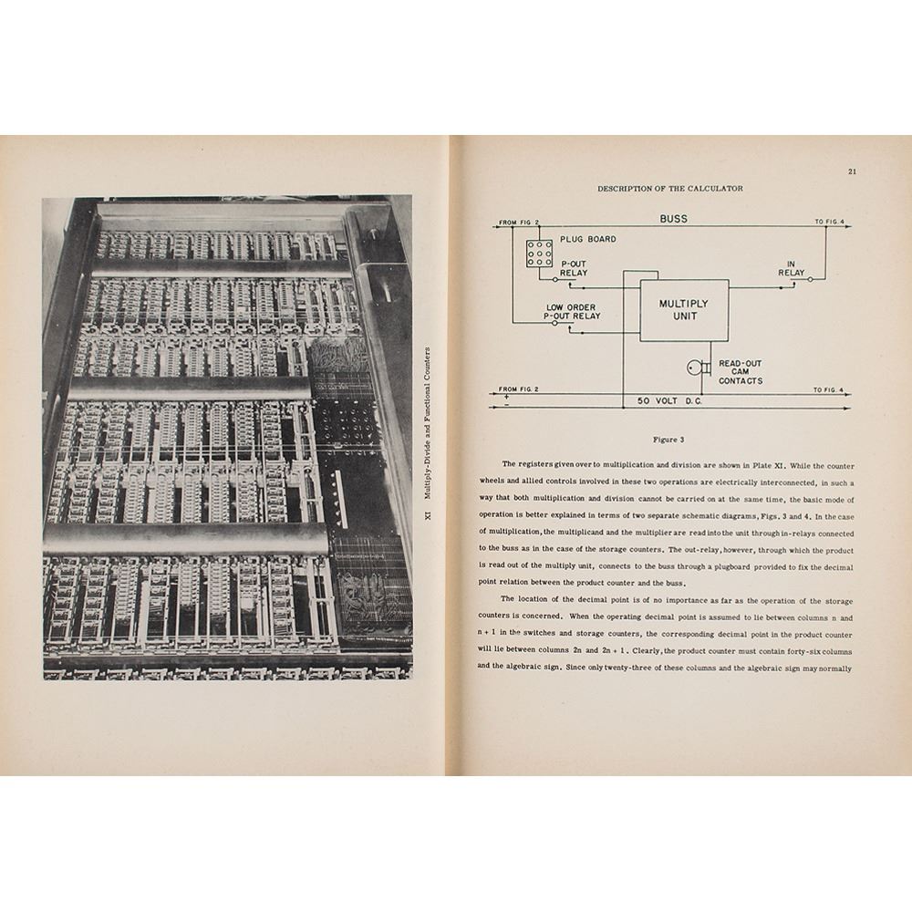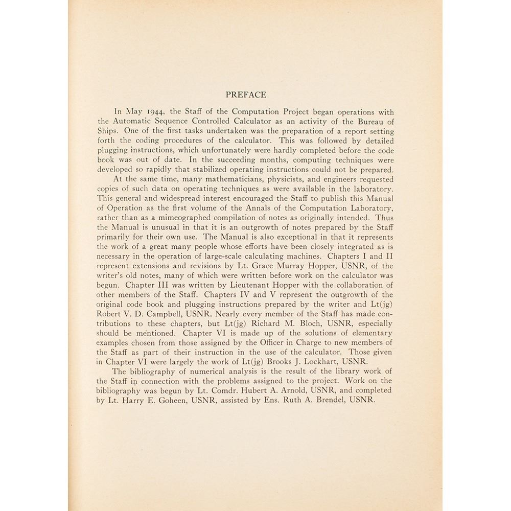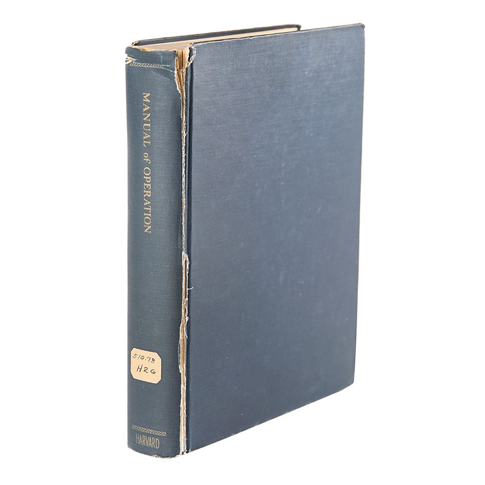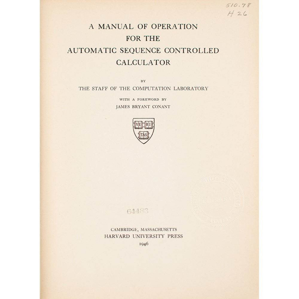 Rare and important early book on computer design and operation: The Annals of the Computation Laboratory of Harvard University, Volume 1: A Manual of Operation for the Automatic Sequence Controlled Calculator by the Staff of the Computation Laboratory, with a foreword by James Bryant Conant. Cambridge, MA: Harvard University Press, 1946. Hardcover, 8 x 11, 561 pages complete with 17 plates and numerous text illustrations. The preface notes that the first few chapters were written by Lt. Grace Hopper, a computer science pioneer and one of the first programmers of the Harvard Mark I computer (also known as the IBM Automatic Sequence Controlled Calculator (ASCC)). Book condition: G+/None, with splitting to the spine cloth and tails, edgewear, and ex-library markings from the California Institute of Technology.