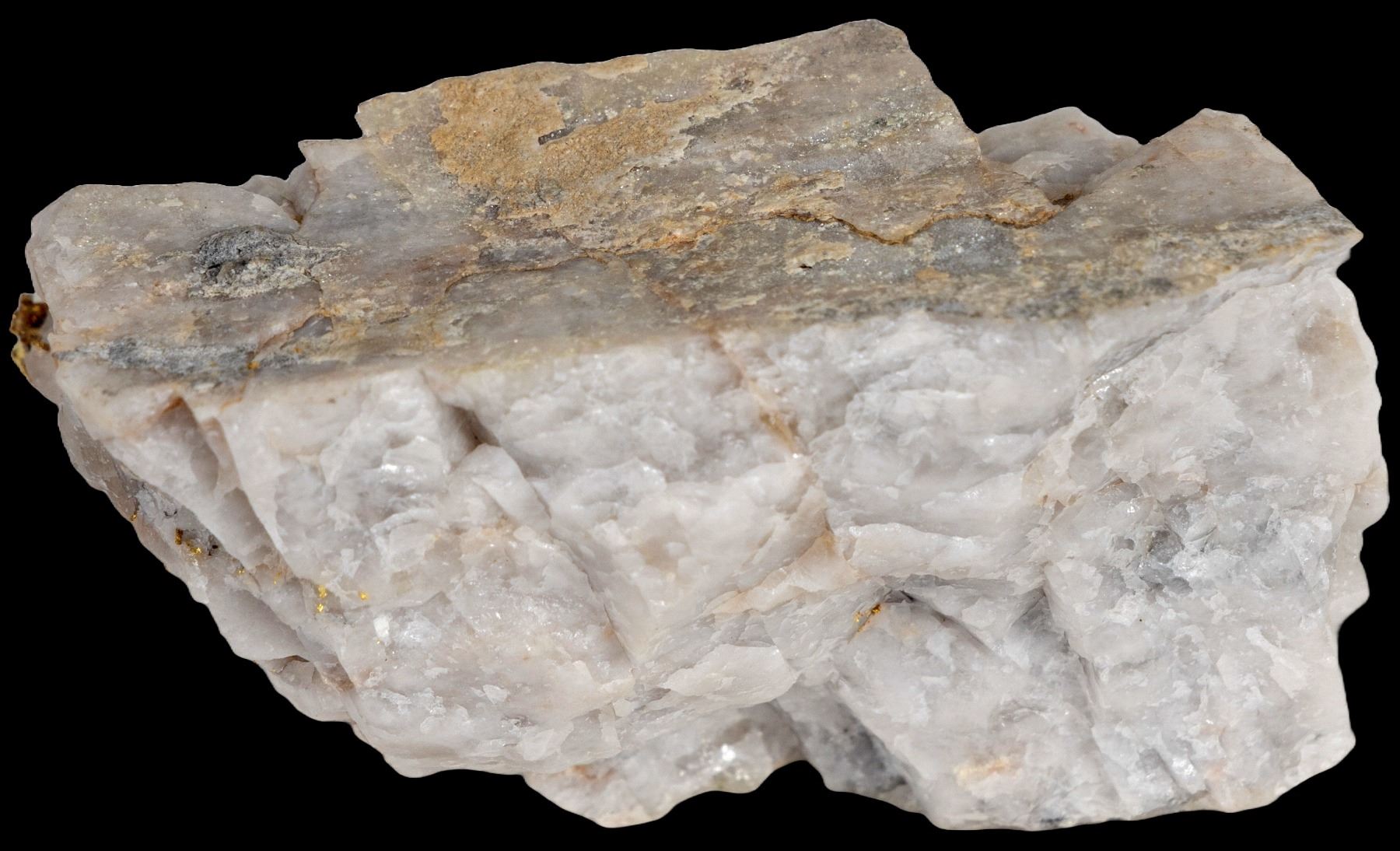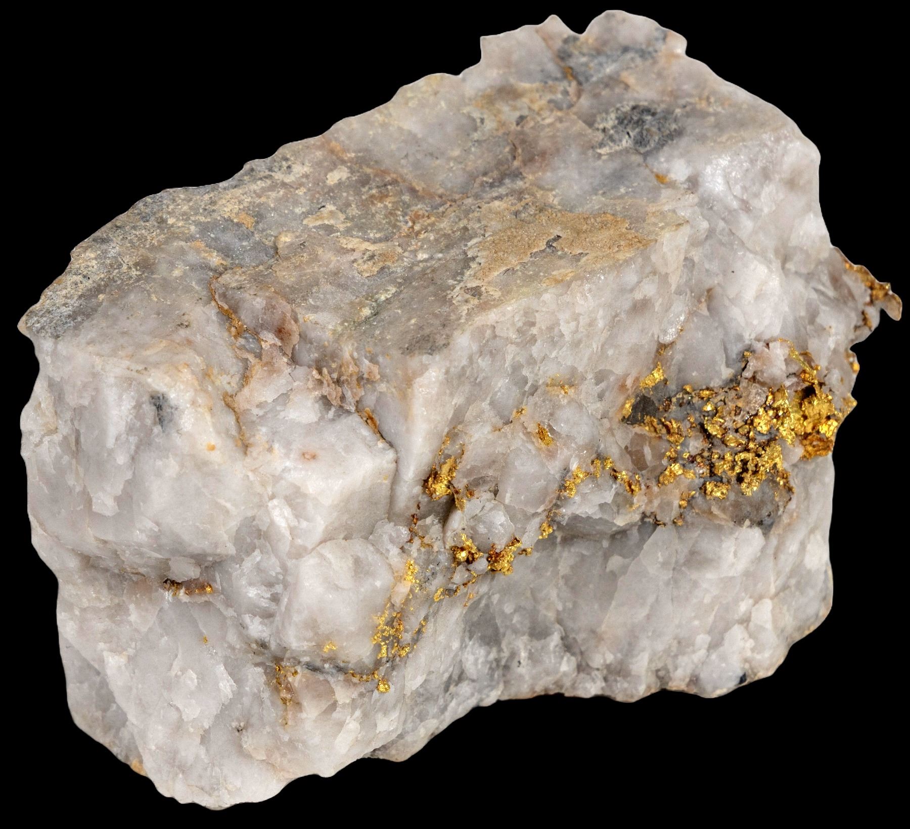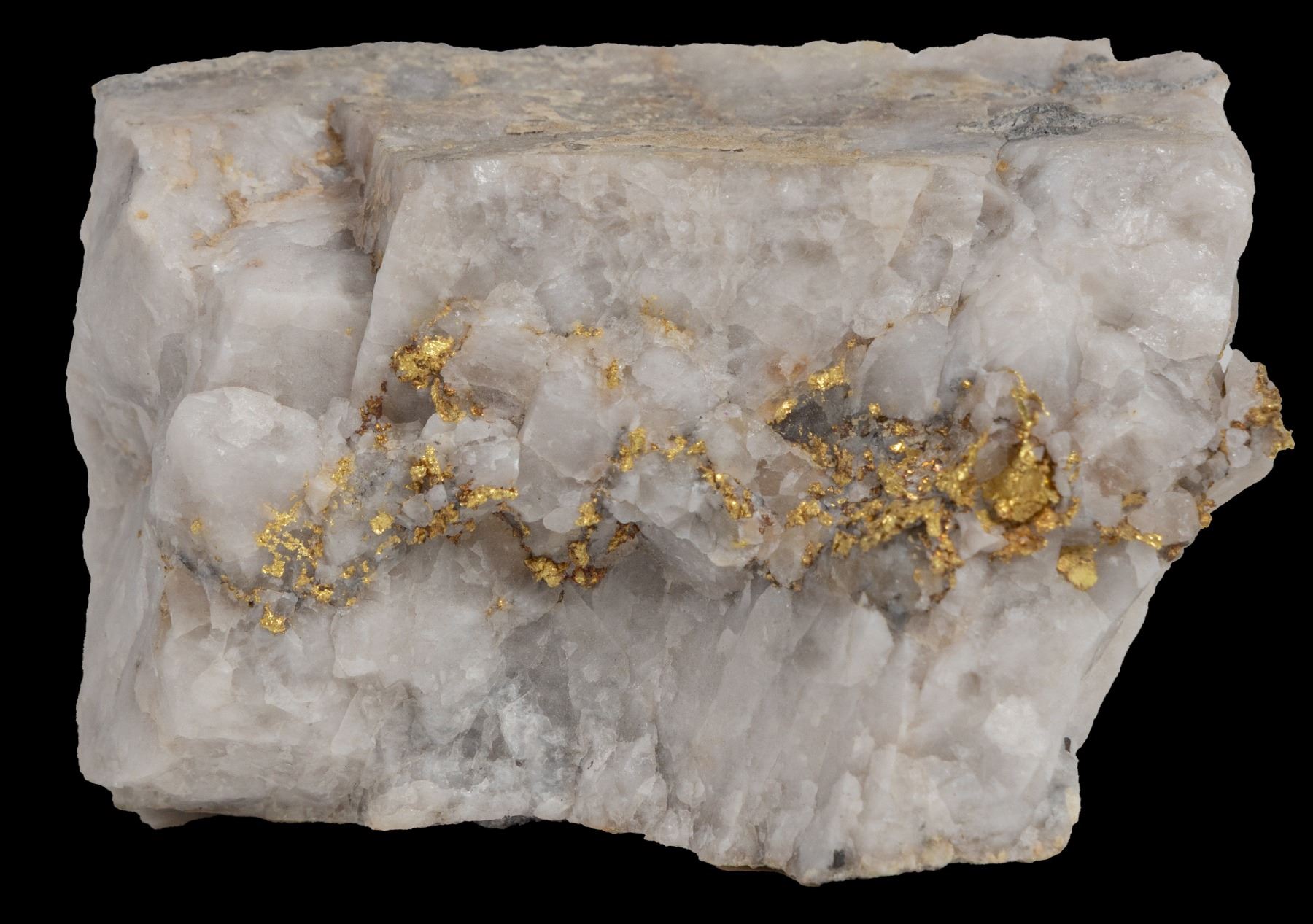Near Jamestown, Tuolumne County, California. 168 grams. Perhaps 25 grams of gold? 2.5 L x 1.75 W x 1.75" H. Native gold in quartz. Vein was 1.75" wide with crystalline gold right in the middle. Mined about the year 2000. Harvard Mine has produced some of the most beautiful native gold specimens from California. Specimens were collected as early as the 1850s and can be found in every major mineral museum in America. This specimen has not yet been curated.