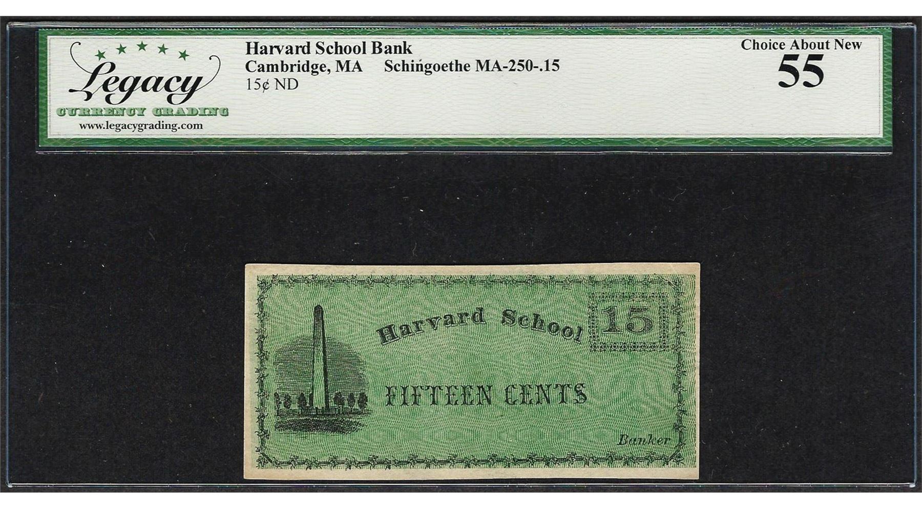 One Harvard School Bank 15 Cents Cambridge, MA Obsolete Note Legacy Choice About New 55. Legacy Graded.