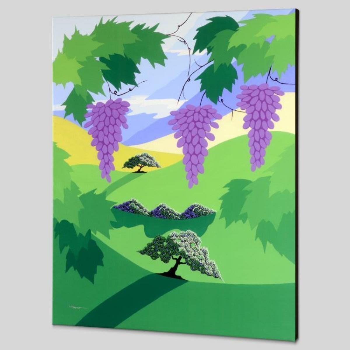 Larissa Holt, a student of distinguished artist Eyvind Earle (1916-2000), uses bold colors and breathtaking scenery to create images of Nature in her own unique style. "Harvest" is a limited edition giclee on stretched canvas by Holt, numbered and bearing Holt's authorized signature. This piece comes gallery wrapped. Includes Letter of Authenticity. Measures approx. 21.5" x 27" x 1.5" (image).