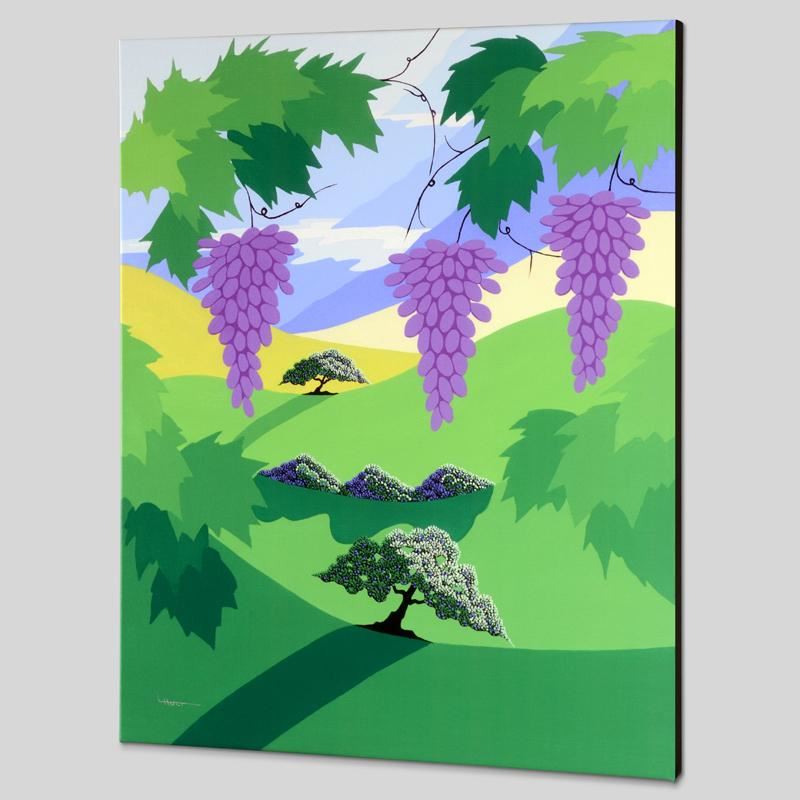 Larissa Holt, a student of distinguished artist Eyvind Earle (1916-2000), uses bold colors and breathtaking scenery to create images of Nature in her own unique style. "Harvest" is a limited edition giclee on stretched canvas by Holt, numbered and bearing Holt's authorized signature. This piece comes gallery wrapped. Includes Certificate of Authenticity! Measures approx. 21.5" x 27" x 1.5" (image).