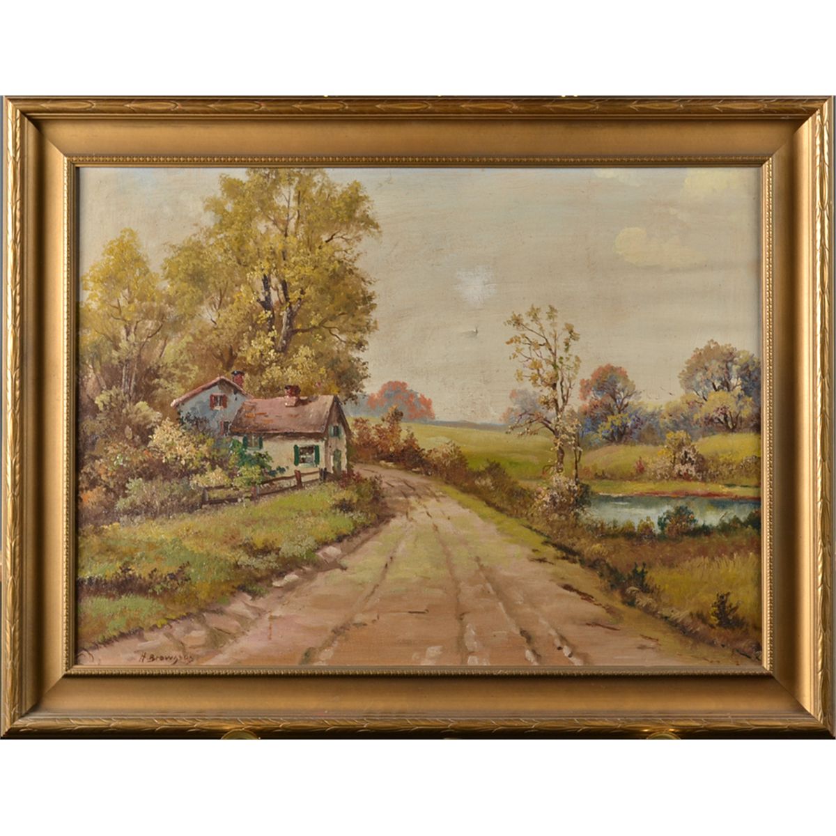 Painted to depict a landscape with country road and building. Signed LL. Harvey A. Brownson (20th century), Italy/USA was known for his landscapes. 22" H x 30" W, sight, 27" H x 35.5" W, framed. Circa 1940's-1950's. Private collection Lapeer, MI.
