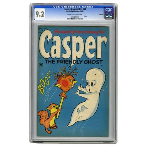 <B>Harvey Comics Hits #61 Casper The Friendly Ghost - File Copy (Harvey, 1952) CGC NM- 9.2 Cream to off-white pages.</B></I> This is just the third Harvey appearance of Casper, and we had never seen a high-grade copy before today! In fact, this is the only copy graded higher than 7.0 that appears on the CGC census as of this writing. The cover art appears to be the work of Bill Hudson. Overstreet 2006 NM- 9.2 value = $550. CGC census 3/06: 1 in 9.2, none higher.