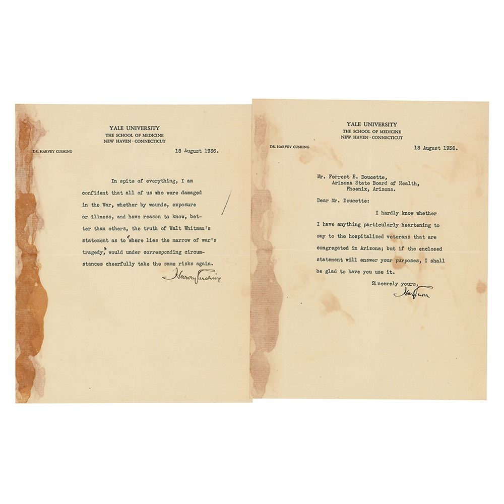 Surgeon (1869–1939) who pioneered many modern neurosurgical techniques and investigated the functions of the pituitary gland. Two TLSs, signed "Harvey Cush" and "Harvey Cushing," each one page, 6.75 x 8.5, Yale University School of Medicine letterhead, both dated August 18, 1936. Cushing replies to a request from Forrest E. Doucette of the Arizona State Board of Health, in full: "I hardly know whether I have anything particularly heartening to say to the hospitalized veterans that are congregated in Arizona; but if the enclosed statement will answer your purpose, I shall be glad to have you use it." The signed statement is included, in full: "In spite of everything, I am confident that all of us who were damaged in the War, whether by wounds, exposure or illness, and have reason to know, better than others, the truth of Walt Whitman's statement as to 'where lies the marrow of war's tragedy,' would under corresponding circumstances cheerfully take the same risks again." In very good to fine condition, with scattered small stains to the first page, and heavy adhesive staining to the left edge of each page.