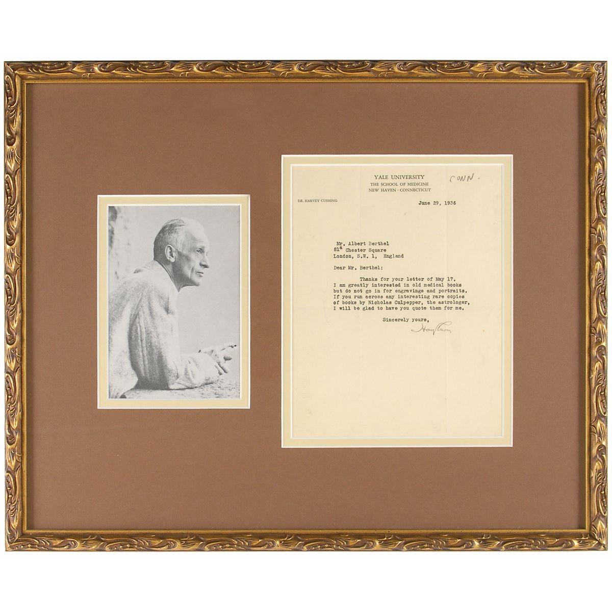 Surgeon (1869–1939) who pioneered many modern neurosurgical techniques and investigated the functions of the pituitary gland. TLS, one page, 6 x 7.75, Yale University School of Medicine letterhead, June 29, 1936. Letter to Mr. Albert Berthel, in part: “I am greatly interested in old medical books but do not go in for engravings and portraits. If you run across any interesting rare copies of books by Nicholas Culpepper [sic], the astrologer, I will be glad to have you quote them for me.” Double-matted and framed with a portrait of Cushing to an overall size of 17.25 x 14. In fine condition, with a few scattered surface creases and intersecting folds (one vertical fold passing through signature). An avid book collector, Cushing amassed an enormous library of scientific literature throughout his life, ranging from medieval and Renaissance medical manuscripts to works of obscure scientists—including over a hundred different editions of botanist Nicholas Culpeper’s works. A desirable letter related to his famous collection, the majority of which is now housed at his alma mater, Yale University.