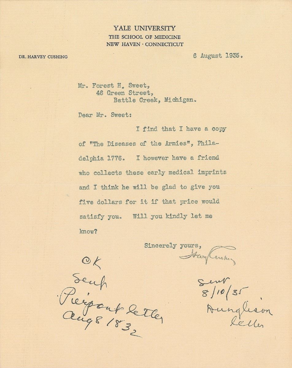 TLS, one page, 6.75 x 8.5, personal Yale University letterhead, August 6, 1935. Letter to pioneering autograph dealer Forest H. Sweet, in part: “I find that I have a copy of ‘The Diseases of the Armies,’ Philadelphia 1776. I however have a friend who collects these early medical imprints and I think he will be glad to give you five dollars for it if that price would satisfy you. Will you kindly let me know?” In fine condition. Forest Sweet was an antiques and autograph dealer who helped Cushing assemble a massive collection of books and manuscripts, including some of the most important and unique medical and scientific volumes.
