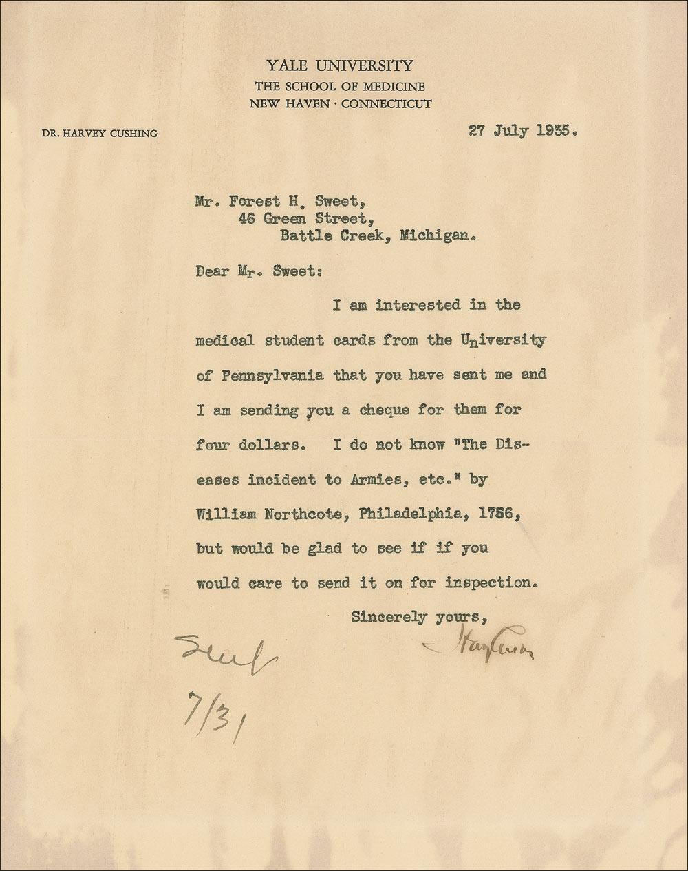 Surgeon who pioneered many modern neurosurgical techniques and investigated the functions of the pituitary gland. TLS, one page, 6.75 x 8.5, Yale University letterhead, July 27, 1935. Letter to a gentleman in Michigan. In part: “I am interested in the medical student cards from the University of Pennsylvania…I do not know ‘The Diseases Incident to Armies, etc’…but would be glad to see if if [sic] you would care to send it on for inspection.” Central horizontal and vertical fold, a mild shade of uniform toning, and office notation to lower left, otherwise fine condition.
