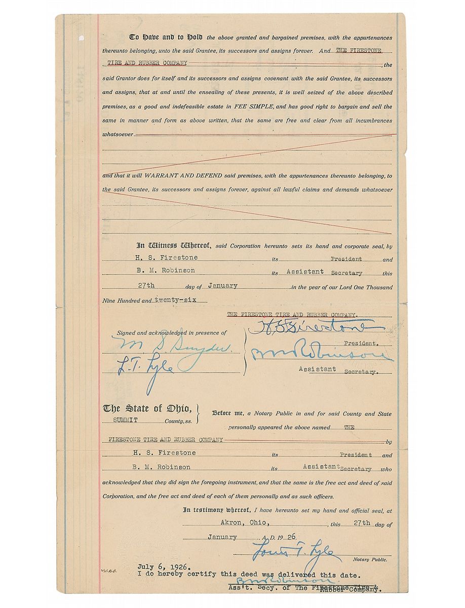 American industrialist (1868–1938) who organized the Firestone Tire & Rubber Company in 1900. He later became a close associate of Henry Ford and the main supplier of tires for Ford’s automobiles. Partly-printed DS, signed “Harvey S. Firestone,” two pages, 8.5 x 14, January 27, 1926. Warranty deed from the Firestone Tire and Rubber Co. to the Pennsylvania, Ohio and Detroit Railroad Company, transferring a “piece or parcel of land situate in the City of Akron.” Nicely signed at the conclusion by Firestone, as well as his secretary and witnesses. Expected document wear and a tape-repaired tear to the unsigned page, otherwise fine condition