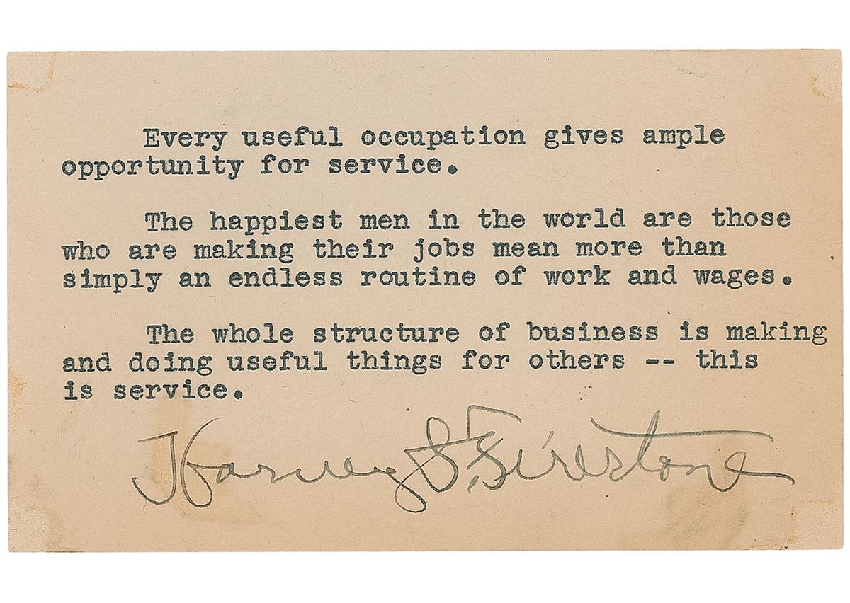 TQS on an off-white 5 x 3 card, signed in fountain pen, “Harvey S. Firestone.” Quote reads, in full: “Every useful occupation gives ample opportunity for service. The happiest men in the world are those who are making their jobs mean more than simply an endless routine of work and wages. The whole structure of business is making and doing useful things for others—this is service.” Toning and trivial surface loss to corners from previous mounting, otherwise fine condition.