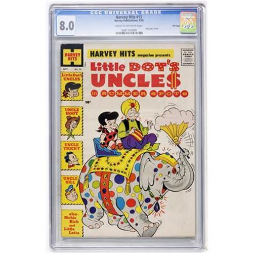 <B>Harvey Hits #13 Little Dot's Uncles - File Copy (Harvey, 1958) CGC VF 8.0 Cream to off-white pages.</B></I> Little Dot's Uncles. Only copy certified by CGC at this time. Overstreet 2007 VF 8.0 value = $76. CGC census 1/08: 1 in 8.0, none higher.<BR><BR><b>Shipping:</b> Comics - Slabbed (certified) (<a target="_blank" href="http://www.heritageauctions.com/common/shipping.php">view shipping information</a>)
