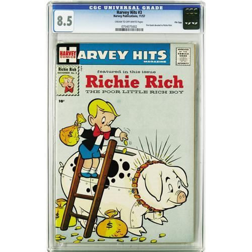 <B>Harvey Hits #3 Richie Rich - File Copy (Harvey, 1957) CGC VF+ 8.5 Cream to off-white pages.</B></I> This is the first comic book devoted to Richie Rich, who first appeared in the pages of <B>Little Dot</B></I>. The concept of a newsstand with only one Richie comic for sale boggles the mind, since the character would become almost a publishing empire unto himself in years to come! And finding this book in high grade is quite a chore indeed, so don't miss this file copy. Overstreet 2006 VF 8.0 value = $913; VF/NM 9.0 value = $1,534. CGC census 3/06: 1 in 8.5, 6 higher.