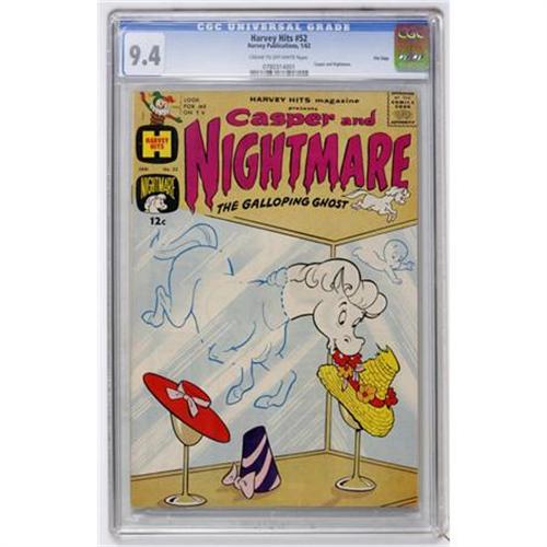 <B>Harvey Hits #52 Casper and Nightmare - File Copy (Harvey, 1962) CGC NM 9.4 Cream to off-white pages.</B></I> Casper and Nightmare star. Overstreet 2007 NM- 9.2 value = $60. CGC census 10/07: 1 in 9.4, none higher.<BR><BR><b>Shipping:</b> Comics - Slabbed (certified) (<a target="_blank" href="http://www.heritageauctions.com/common/shipping.php">view shipping information</a>)