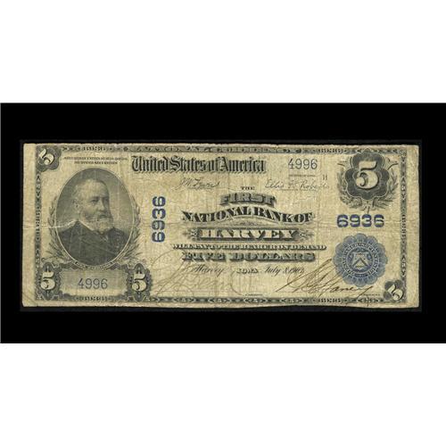 <B>Harvey, IA</B></I> - $5 1902 Plain Back Fr. 598 <B>The First NB</B></I> Ch. # 6936<BR>This note really saw its fair share of midwestern commerce. A tear is noted at left, but the signatures remain. <B>Very Good.</B></I>