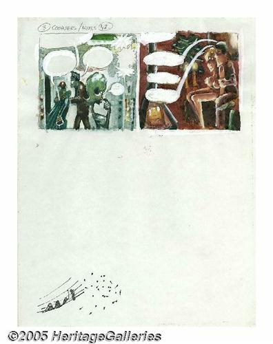<B>Harvey Kurtzman - Little Annie Fanny Color Preliminary Original Art (undated).</B></I> <I>Little Annie Fanny</B></I> was one of the most expensive comic strip series ever produced -- each page was fully painted by a team of talented cartoonists, all under the direction of Harvey Kurtzman. The hall of fame creator controlled the production of the <I>Little Annie Fanny</B></I> stories by working out each scene with meticulous layouts and color preliminaries. This lot features a mixed-media study for panels one and two of page three of a "Computer Story." The image area of the art measures approximately 7" x 3.5", and the condition is Very Good.