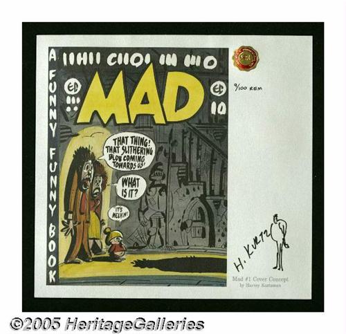 <B>Harvey Kurtzman - Mad # 1 Cover Concept Remarque Edition Print, #9/100 (Another Rainbow, 1991).</B></I> In October of 1952, <B>Mad</B></I> #1 hit the stands. Edited and inspired by Harvey Kurtzman, the comic book was very much a reflection of his sensibilities and sense of humor. And let's not forget that possession of a copy was grounds for detention in many schoolrooms. For millions, <B>Mad</B></I> was their first introduction to irony and subversion, and its brand of humour influenced a whole generation of stand-up comedians and other not-so-wide-eyed types who shared <B>Mad</B></I>'s suspicion of the people in charge. This special Remarqued Edition print of Harvey Kurtzman's cover concept painting for <B>Mad</B></I> # 1 is print number 9/100. The print paper size is 10.5" x 10.5", with an image area of 6.5" x 9". It has been signed by Harvey Kurtzman and comes with a certificate of authenticity. The print is made with fine archival quality paper, and is in Excellent Condition. Here's your chance to own a genuine piece of American pop culture!