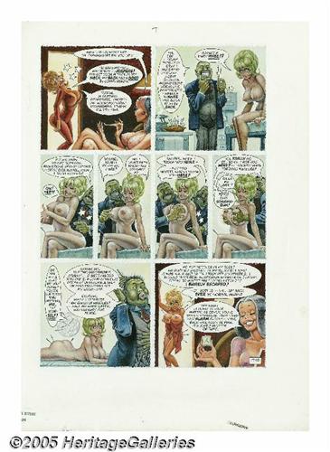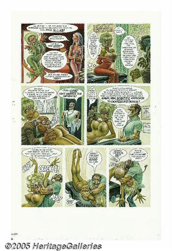 <B>Harvey Kurtzman and Bill Elder - Little Annie Fanny, Complete 3-page Story Original Art (Playboy, 1975).</B></I> This mouth-watering three-page romp was unveiled in the March 1975 issue of <B>Playboy</B></I>. Little Annie Fanny, the risque, and hugely popular character created by Harvey Kurtzman and Bill Elder, showcased her curves each month in <B>Playboy</B></I>, starting in 1962, and all through the seventies and eighties, before ending in 1988. A trip to the chiropractor may not have helped voluptuous Little Annie Fanny, but it does wonders for Dr. Crankshaft. Later, still seeking relief from her backache, Little Annie Fanny gets "poked" by an acupuncturist downstairs. The Annie yarns took comic art to a new finish with their painstakingly painted stories, rendered for "full process" color. Painted in gouache on board, each page has an image area of 10.5" x 15", and all are in Excellent condition. Also included in the lot is a typed letter from Michelle Urry, <B>Playboy</B></I> Cartoon Editor. The letter, dated June 26, 1975, and addressed to Harvey Kurtzman, grants Kurtzman the right to: "..sell the artwork as a collector's item to anyone you wish," but notes, "<B>Playboy</B></I> continues to own all right, title and interest, including all rights of copyright, in and to the cartoon." Satire, political commentary, sexy humor, and artistic innovation are all wrapped up in these, the perkiest pages ever!