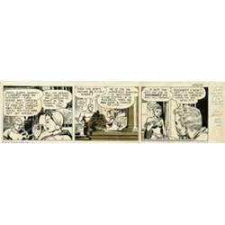 Harvey Kurtzman and Dan Barry - Original Art for Flash Gordon daily dated 4/16/52 (King Features Syndicate, 1952). Dan Barry took over the Flash Gordon dailies from artist Austin Briggs in 1951. during the period of 1952-53, Barry received assistance in both story and art from Harvey Kurtzman, Jack Davis, and Frank Frazetta. The example offered here has story and layouts by Kurtzman and finished art by Barry. It is inscribed on the right-hand edge, "To Curly Quire: With best wishes to a fine artist and a good guy! Dan Barry, Metz France 1956". The piece is in excellent condition, with some yellowing to the zip-a-tone in panel two and some very minor soiling overall, which does not in any way detract from the beauty of this exquisite piece of art. The back bears the notation, "4-7-52, 1st Kurtzman written/layouts. This is the 9th by Kurtzman/Barry." Overall size is approximately 21 1/4" x 5 7/8" with an image area of 19 1/2" x 5 5/8". Important notice: We expect to be auctioning lots at the rate of 200-250 per hour. Sometimes eBay Premier live bid software cannot keep up with that pace, so we strongly recommend that you place a realistic proxy bid now as insurance to avoid disappointment. Also please note that all Heritage/CAA lots purchased through eBay Premier carry a 20% Buyer's Premium.