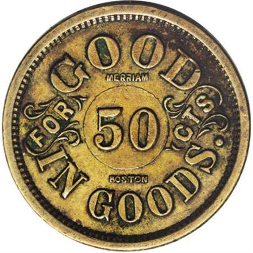 <B>Harvey Lewis, Sutler Token, R.6.</B></I> Issued for the 23rd Massachusetts Regiment and Good For 50 Cents in goods. Listed on page 42 of <I>Civil War Sutler Tokens and Cardboard Scrip</B></I> by Schenkman. Joseph H. Merriam of Boston was the die-sinker who struck this token; his name appears on the reverse. All Sutler tokens are scarce. We expect spirited bidding for this piece.