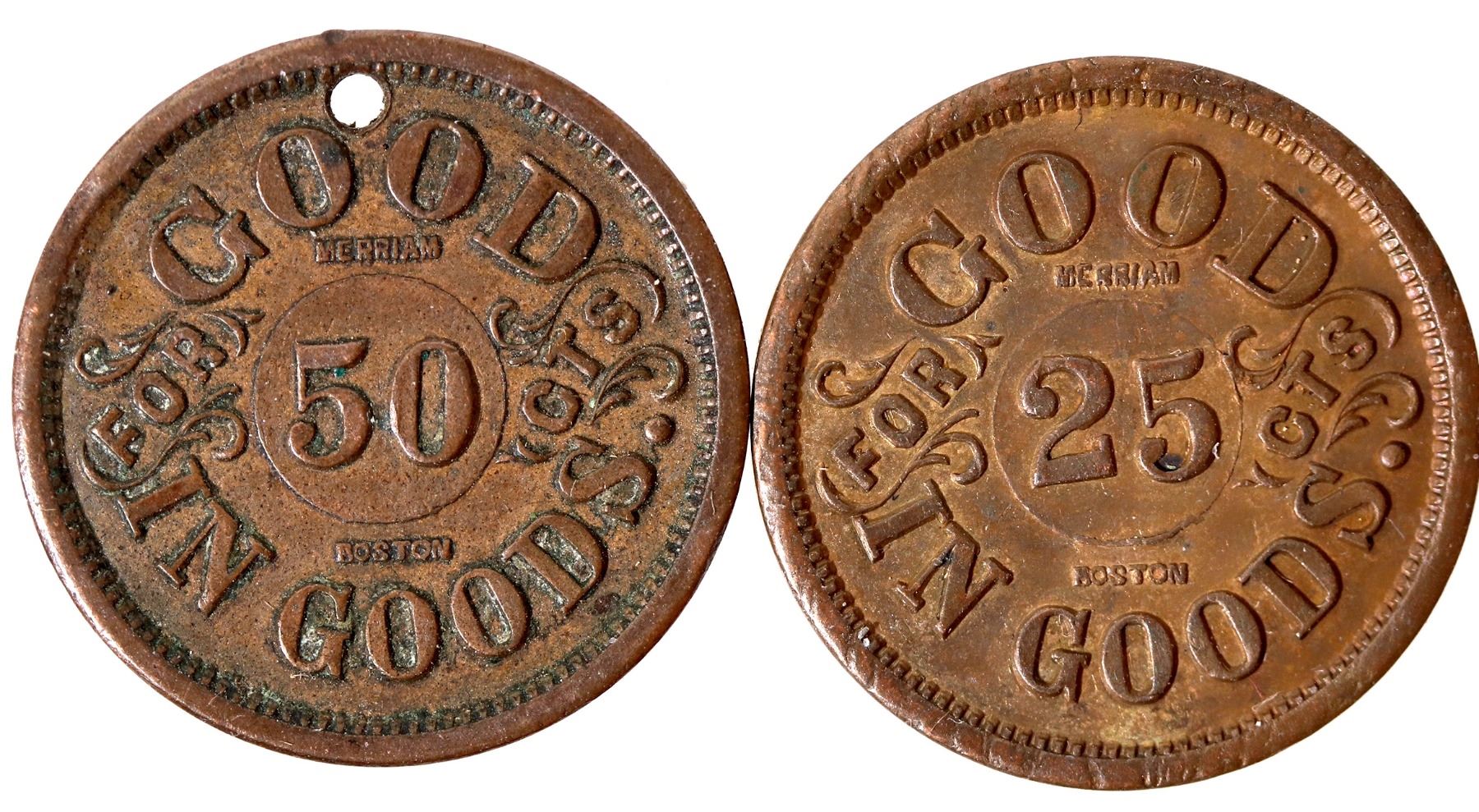 Lot of two: 1) HARVEY LEWIS / (star) / SUTLER / (star) / 23. MASS. / (star) / REGIMENT. // FOR GOOD CTS / MERRIAM / 50 / BOSTON / IN GOODS.; Br., rd., 19 mm, holed. Schenkman-B50C, R.6. 2) HARVEY LEWIS / (star) / SUTLER / (star) / 23. MASS. / (star) / REGIMENT. // FOR GOOD CTS / MERRIAM / 25 / BOSTON / IN GOODS.; Br., rd., 19 mm; still has mint luster, AU-Unc.