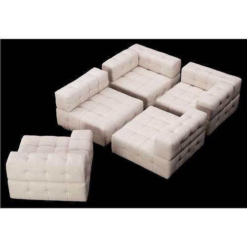 Harvey Probber sectional sofa, by Harvey Probber, Inc., five separate upholstered pieces over platform wood bases with black laminate trim, two corner pieces, one armless piece, one piece with low arm and one with loose cushion with added support piece, s