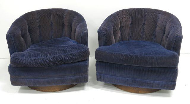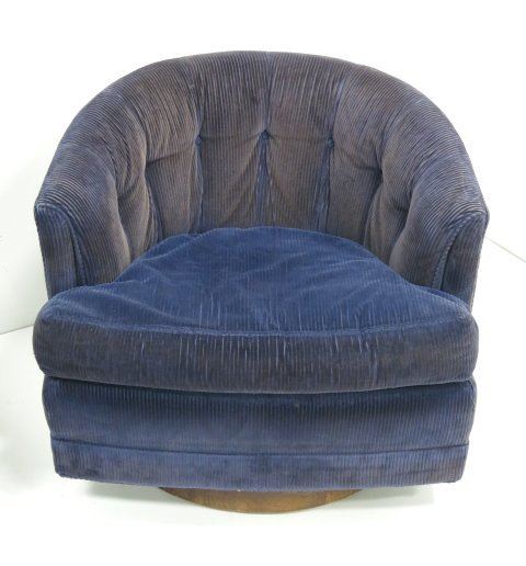 Circa 1970. Purple upholstery. Approx. 26" H x 38" W x 31" D. From the estate of Charlotte Thomas. Finish worn in feet. Upholstery worn.