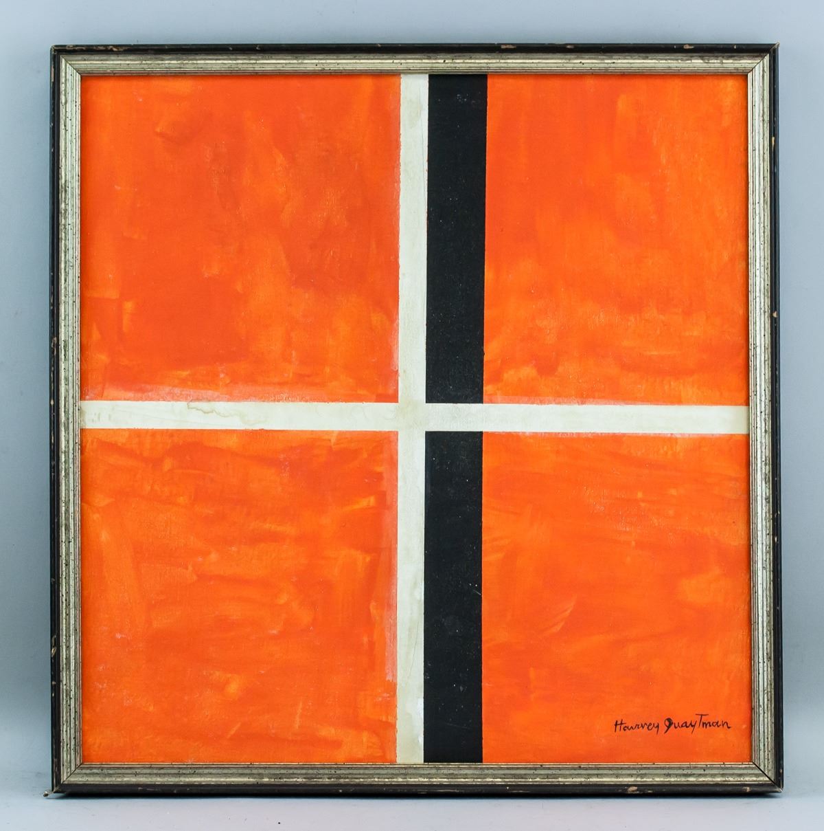 Oil on canvas, framed. Featuring an abstract expressionist composition with geometric lines. Signed Harvey Quaytman on the lower right corner. Attributed to Harvey Quaytman (1937-2002, American). 47 x 46 cm (18.5 x 17.75 in). Frame: 51 x 50 cm (20 x 19.5 in). PROVENANCE: Southern Ontario estate