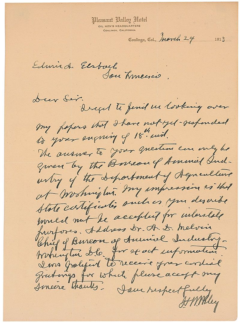 Noted chemist (1844–1930) involved with the passage of the landmark Pure Food and Drug Act of 1906. ALS signed “H. W. Wiley,” one page, 8 x 11, Pleasant Valley Hotel letterhead, March 24, 1913. Letter to Edwin A. Elsbach. In part: “The answer to your question can only be given by the Bureau of Animal Industry of the Department of Agriculture at Washington. My impression is that State certificates such as you describe would not be accepted for interstate purposes. Address Dr. A. D. Melvin Chief of Bureau of Animal Industry—Washington, D.C. for exact information.” In fine condition, with intersecting folds, few light creases, and uniform toning.