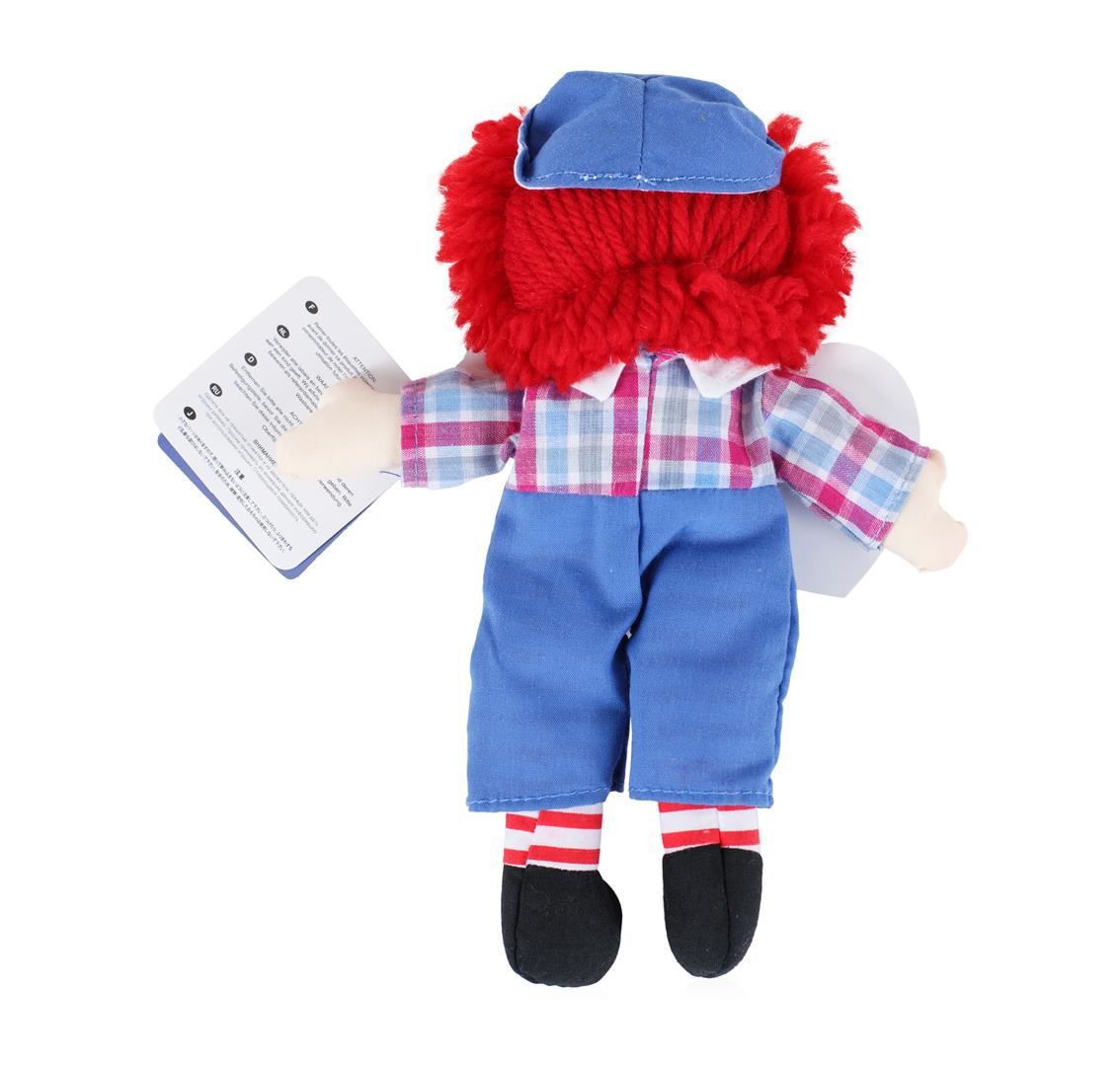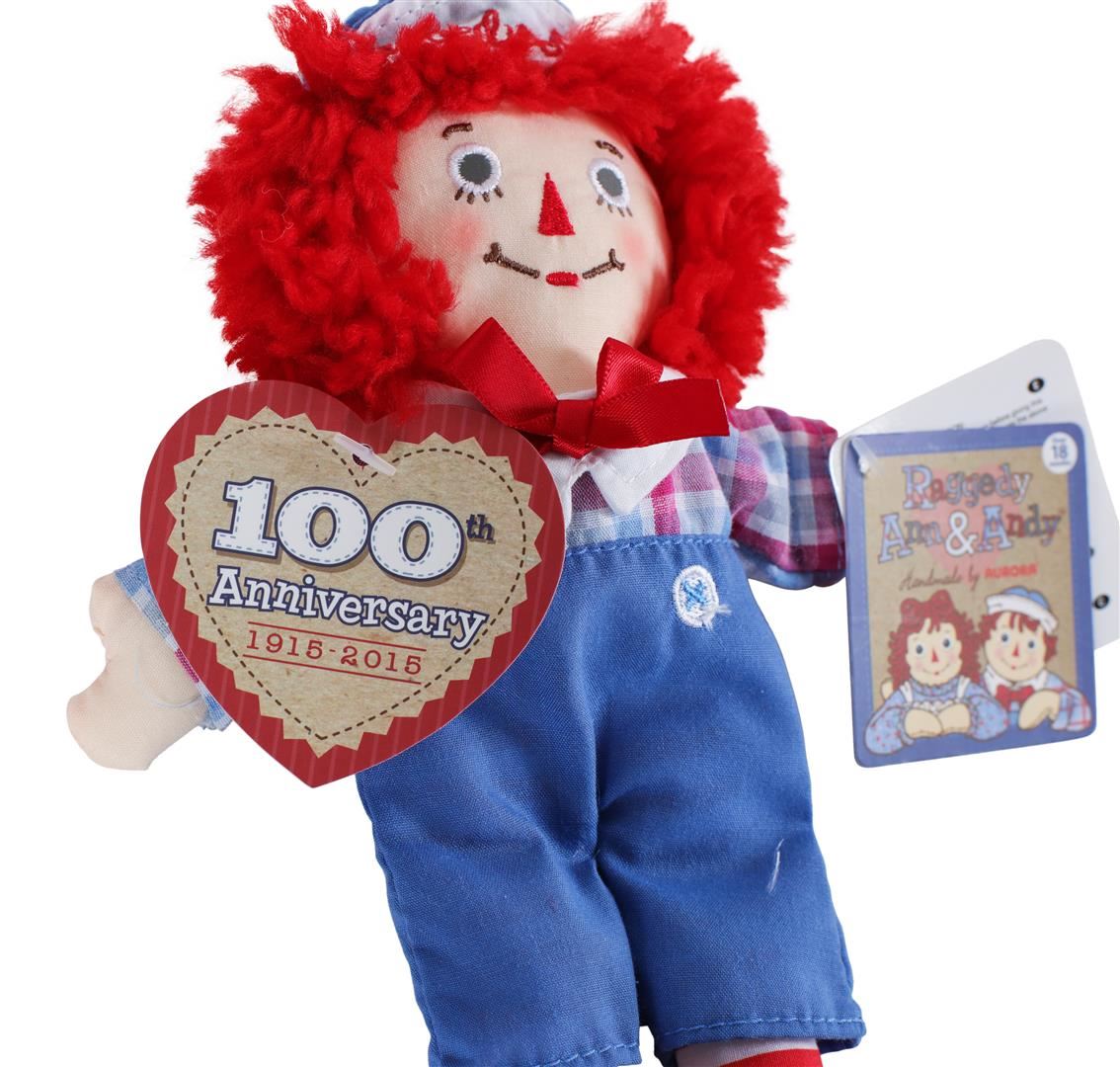 This stuffed rag doll celebrates the 100th anniversary of Raggedy Andy. The stuff rag doll has embroidered facial features and button eyes with non-removable clothes. The item was handmade by Aurora and licensed by Hasbro.