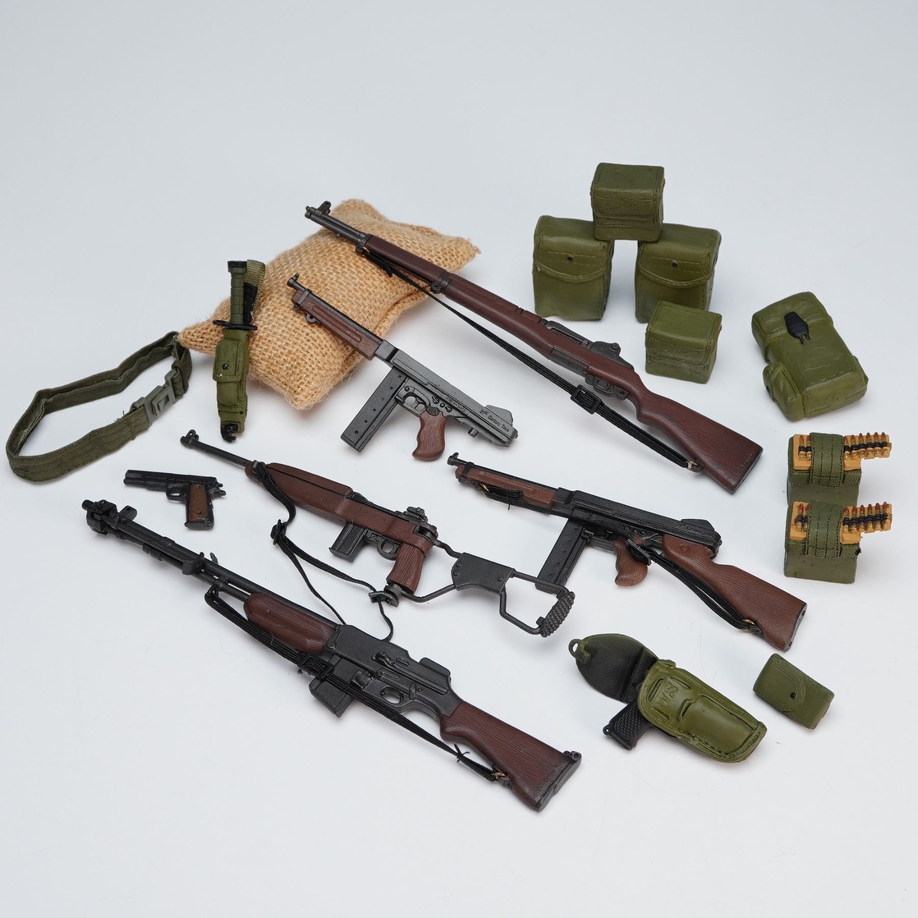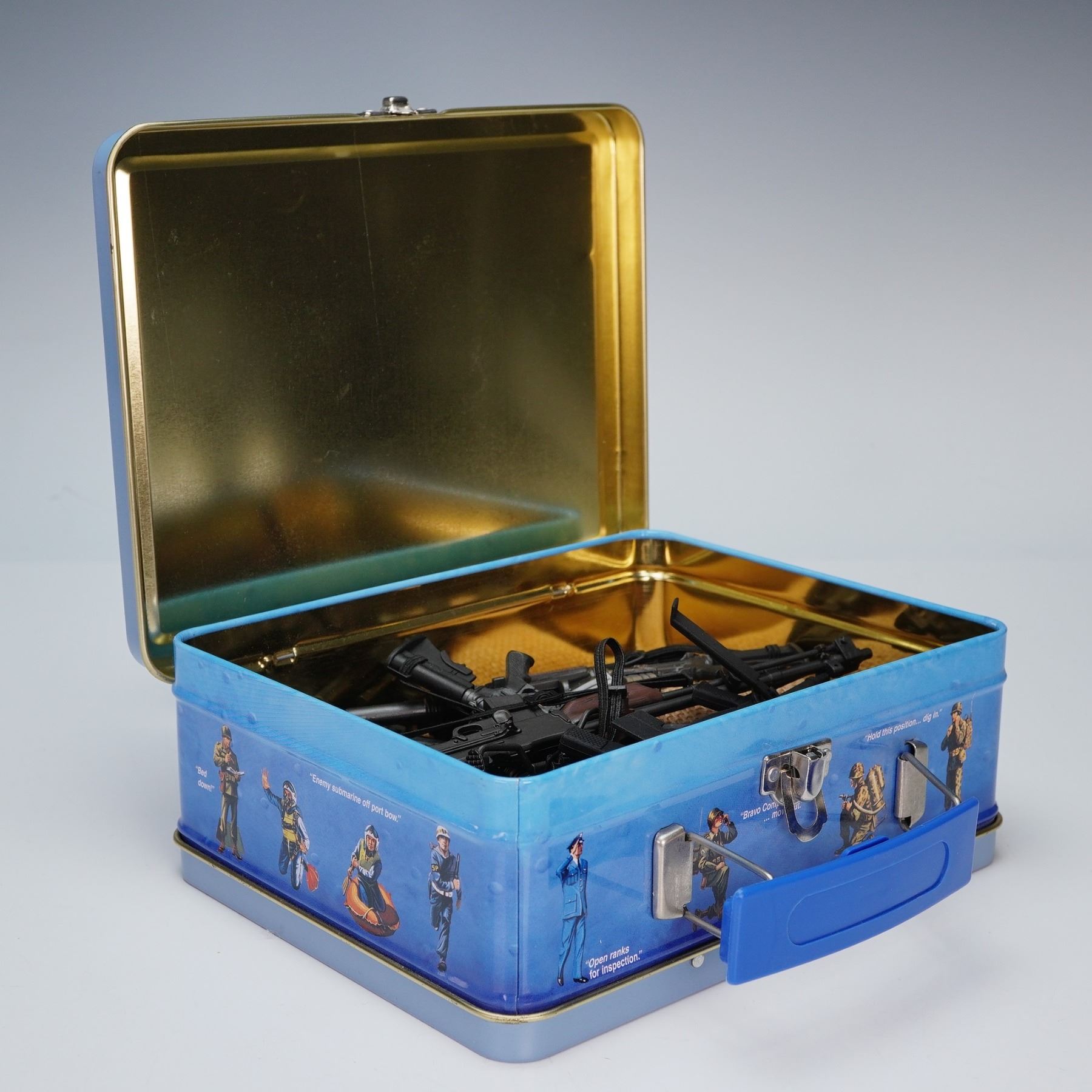 A G.I. Joe Action Sailor metal lunchbox decorated with bold graphics of deep sea diver Joe on the front and action figure illustrations around the sides. The lot includes an assortment of accessories such as rifles, machine guns, and ammo packs.