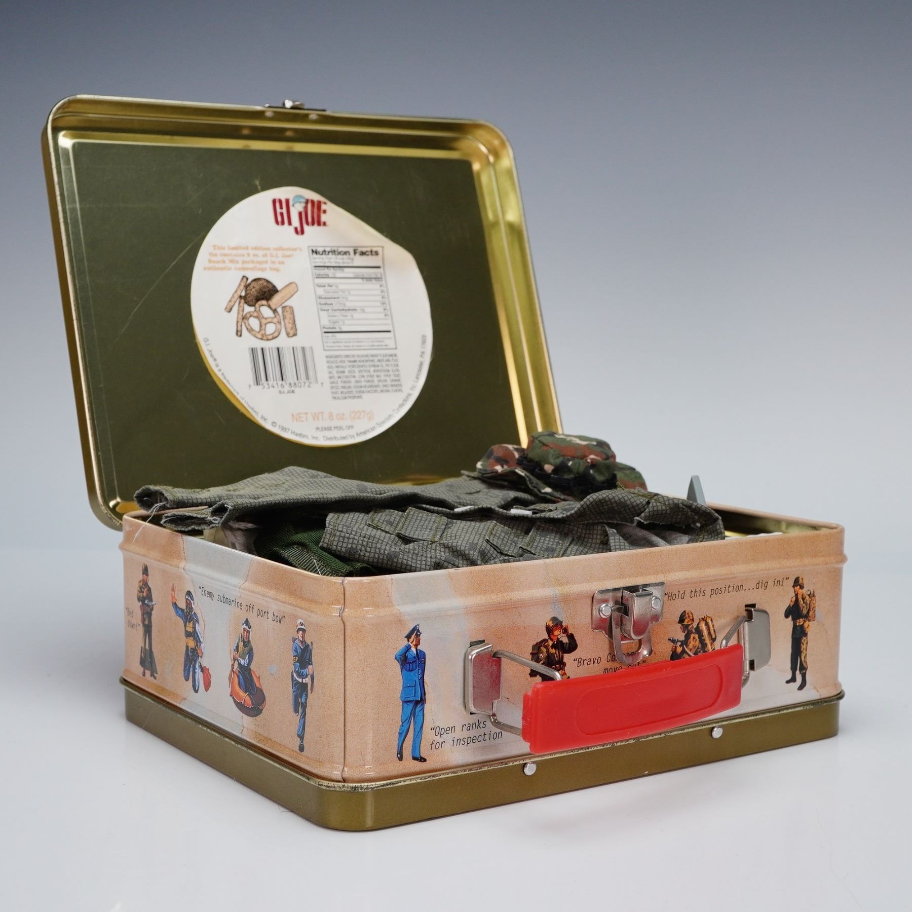 A G.I. Joe Action Soldier metal lunchbox with bold graphics on the front and illustrated figures around the sides. The lot includes a wide assortment of accessories such as military uniforms, boots, weapons, and more.