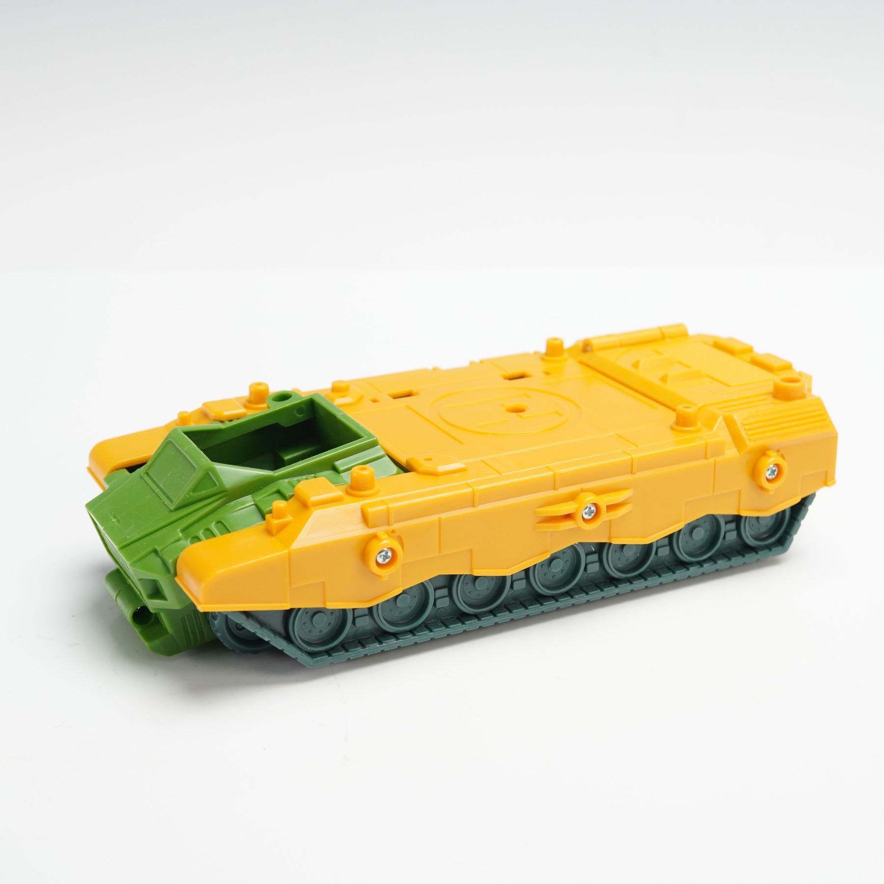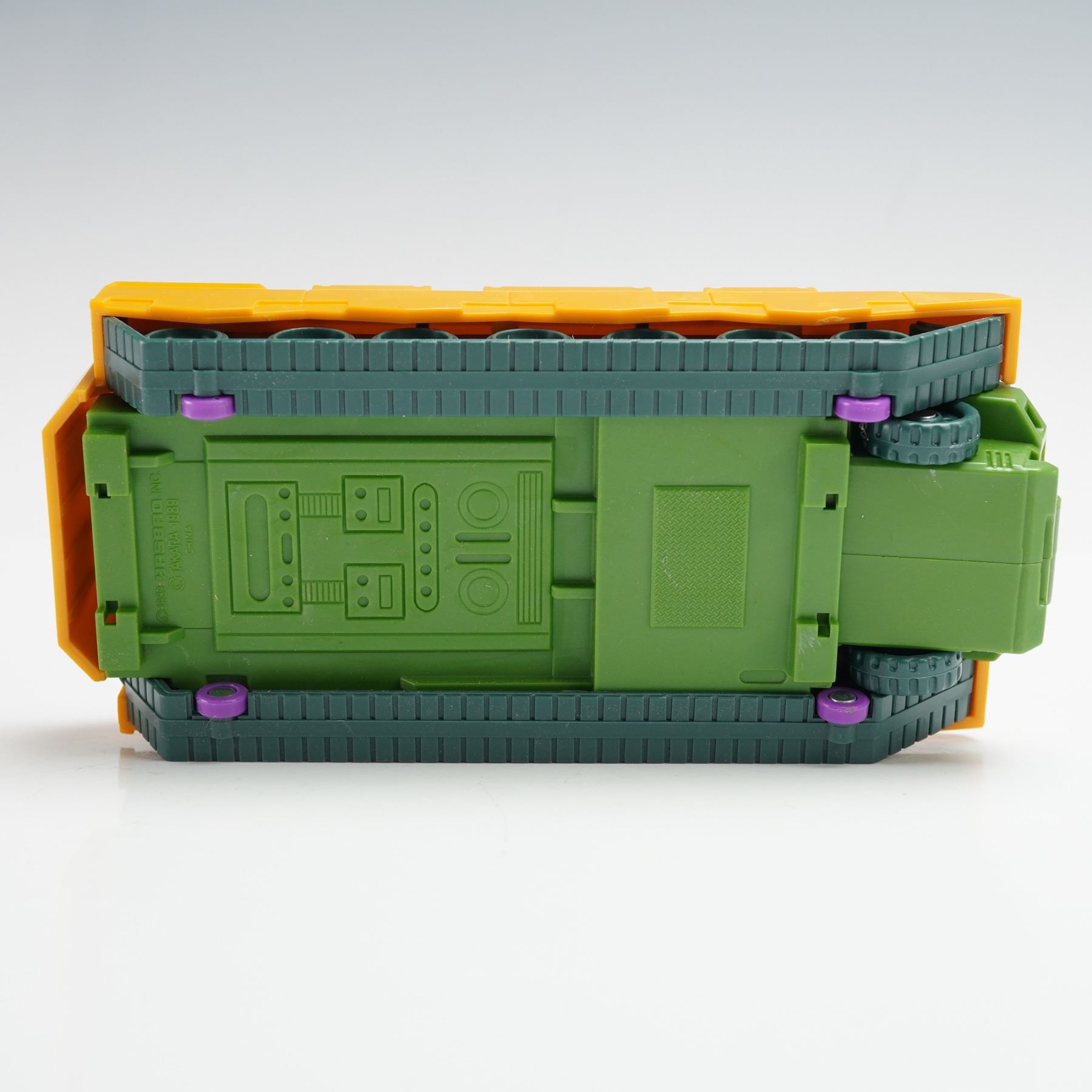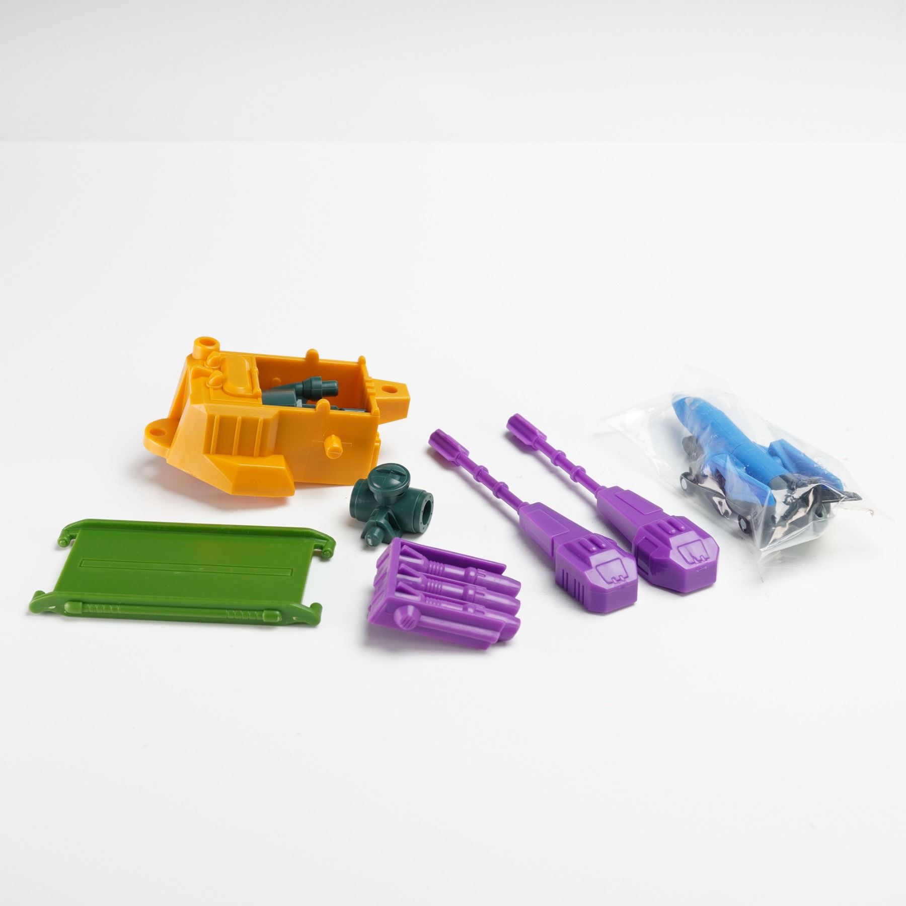 A Transformers Decepticon Anti Aircraft Base from the Micromaster Combiner series. The set includes the yellow and green base vehicle with purple weapon accessories, missiles, and Micromaster figure, all designed to combine with other Micromaster sets. Complete with original packaging, sticker sheet, and instruction booklet, this piece highlights the classic late eighties Transformers design and color scheme. Hasbro backstamp. This item has its original box. Box measures: 12"L x 3.5"W x 8.5"H.