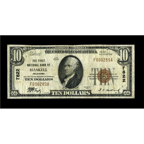 <B>Haskell, OK</B></I> - $10 1929 Ty. 1 <B>The First NB</B></I> Ch. # 7822<BR>Just ten of the 1929 series have been traced from this small issuer in Muskogee County, the only bank in town to have survived long enough to issue this design type. <B>Fine+.</B></I> Certainly worthy of a strong bid in the range of...<BR><BR><b>Shipping:</b> Coin/Currency (<a target="_blank" href="http://www.heritageauctions.com/common/shipping.php">view shipping information</a>)