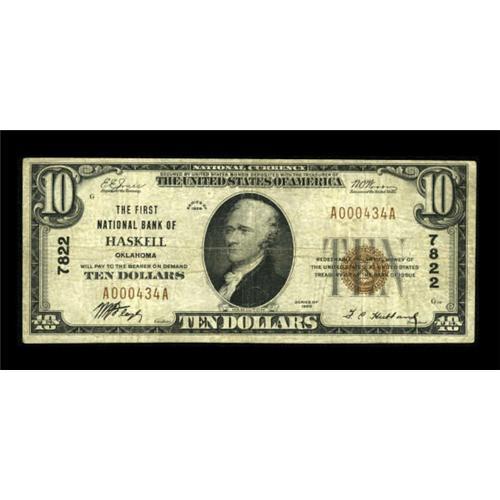 <B>Haskell, OK</B></I> - $10 1929 Ty. 1 <B>The First NB</B></I> Ch. # 7822<BR> The paper is solid and the printed details remain bold. <B>Fine.</B></I><BR><I>From The Kansas City Collection.</B></I><BR><BR><b>Shipping:</b> Coins & Currency (<a target="_blank" href="http://www.heritageauctions.com/common/shipping.php">view shipping information</a>)