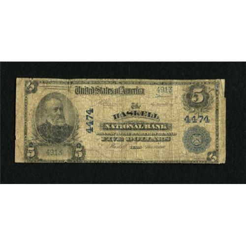 <B>Haskell, TX</B></I> - $5 1902 Plain Back Fr. 601 <B>The Haskell NB</B></I> Ch. # 4474<BR> The census indicated five large size notes are known from this Haskell County issuer. However, only two of those pieces have ever been offered at public auction with the last piece appearing in 2001. Surprisingly neither of the pieces offered were much better than this well circulated issue. <B>Good.</B></I><BR><I>From The Rolling Plains Collection</B></I><BR><BR><b>Shipping:</b> Coins & Currency (<a target="_blank" href="http://www.heritageauctions.com/common/shipping.php">view shipping information</a>)