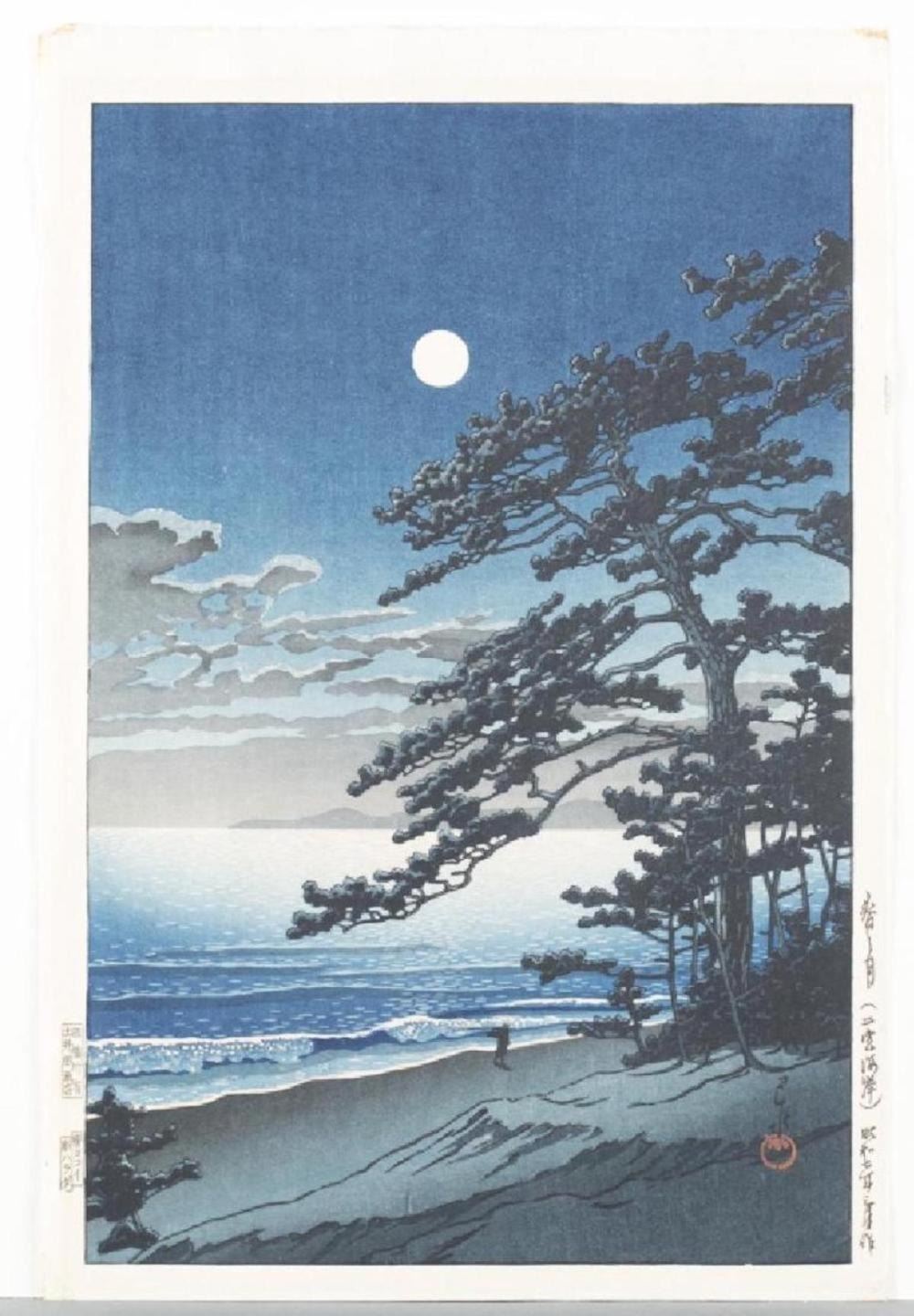 A Japanese woodblock print. Kawase, Hasui (Japan, 1883-1957). Spring Moon at Ninomiya Beach (Haru no tsuki [Ninomiya kaigan]). 1932. Oban, approx. 15"h x 10"w. FINE CONDITION