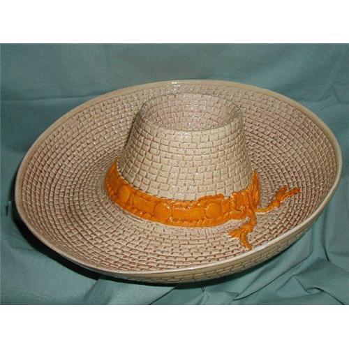 This is a neat way to server chips and salsa, verges and dip, or just as a centerpiece. It is in the shape of a sombrero / sunhat. The top is hollow for your salsa or dip, or a floating candle. Below chips, vegies, or small floral arrangement will set.