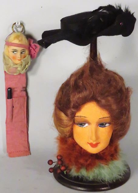 One Millinery Hat Stand with Lady's Head and Hanging Sewing Kit with Lady's Head. Both in Very good condition. Hat stand approx. 10 inches tall.