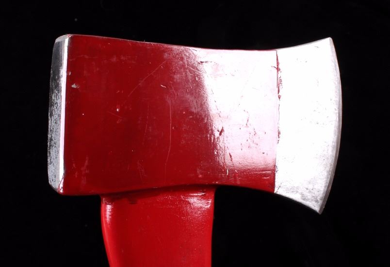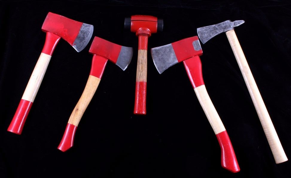 This collection of hatchets, rubber hammer, and tomahawk is a unique group. All of the tools excluding the tomahawk sport a red painted head and handle. The tools included are a Collins hatchet, Sweden 2 1/4 hatchet, unmarked hatchet, Garland No. 3 Split Head Hammer, and a unmarked tomahawk. The pieces are all in good condition. The largest piece measures 19 3/4" L x 6 1/2" W x 3/4" Thick