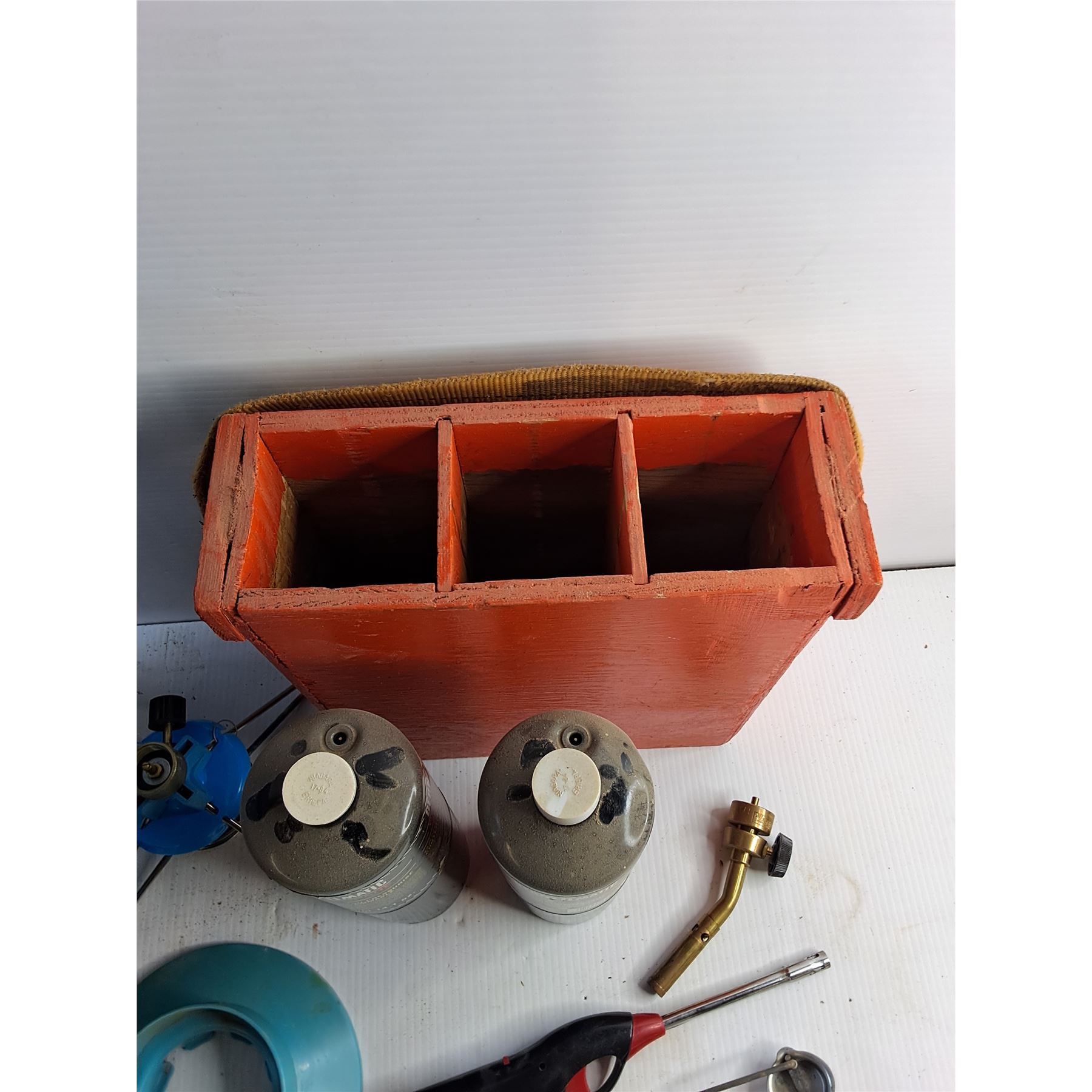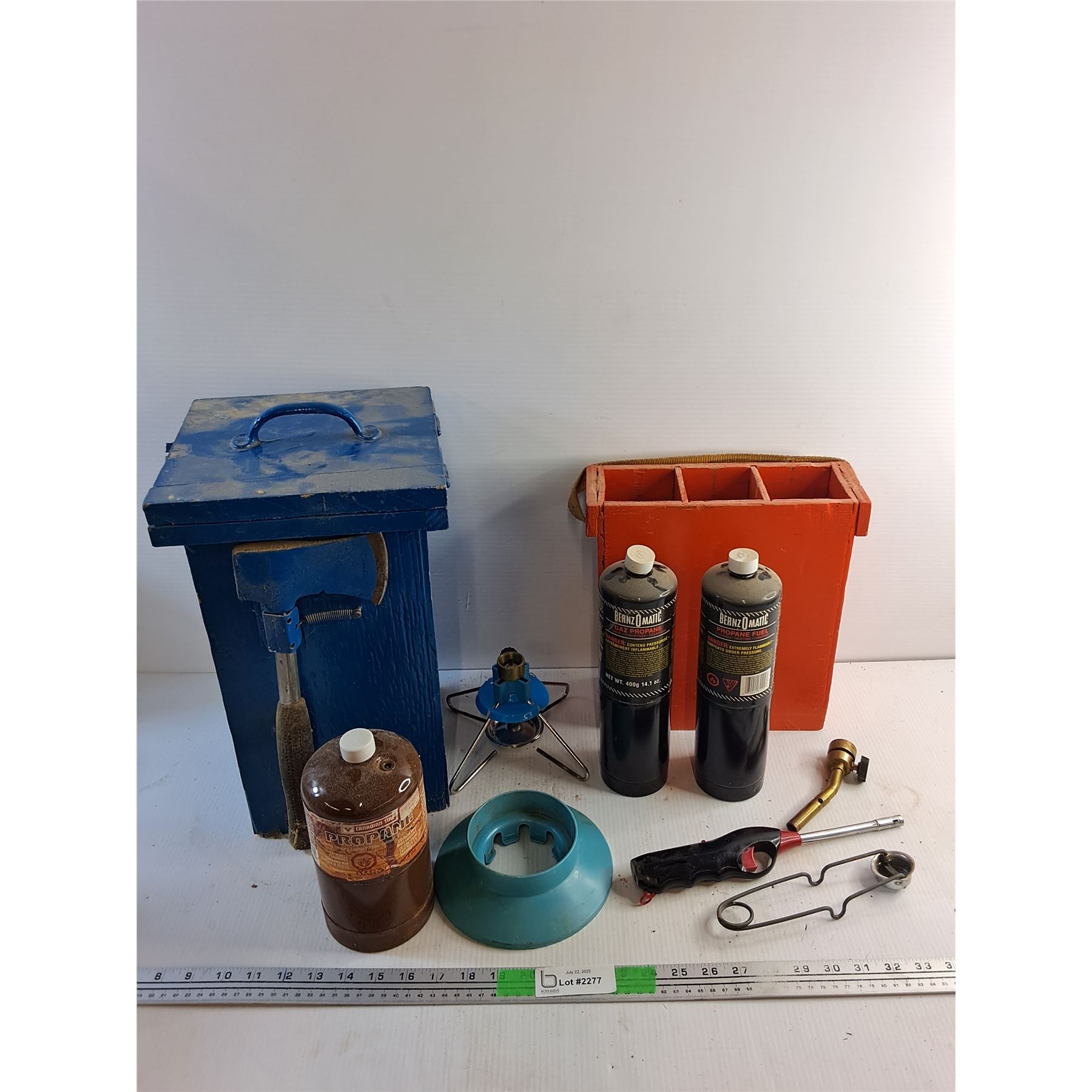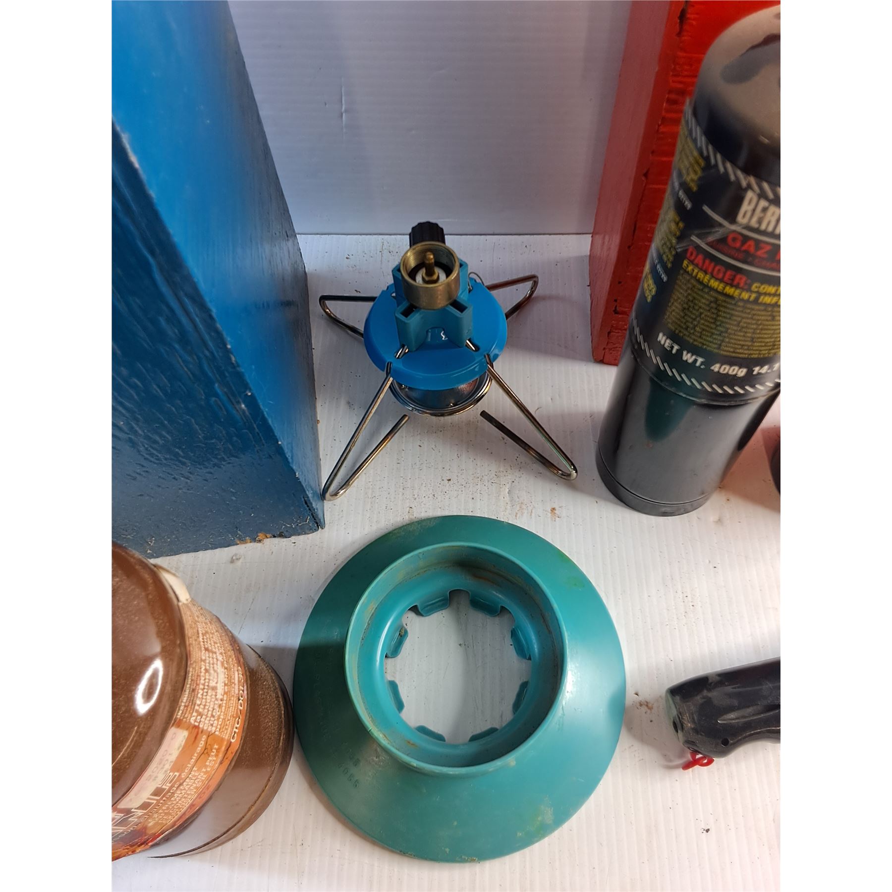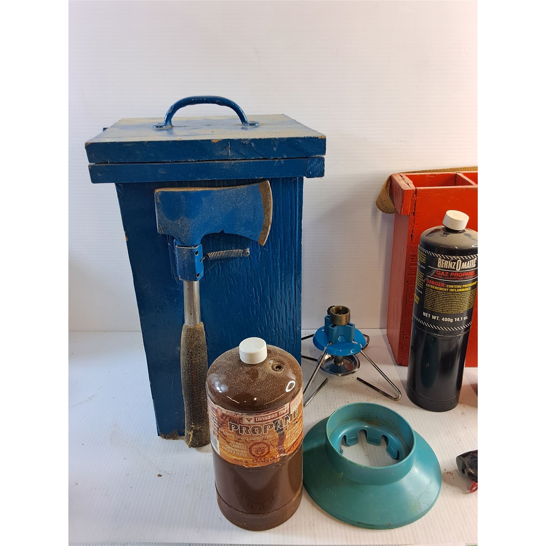 Hatchet, Propane, Propane Stove, BBQ Lighter, Wooden Box and Misc, Cannot Ship
