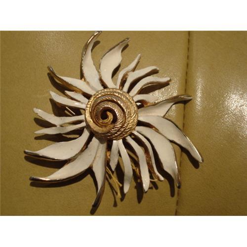 Hattie Carnegie was the top designer of her time. The flower brooch has the swirling center. The petal are white over goldtone. Siged.