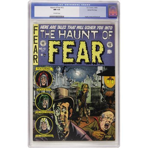<B>Haunt of Fear #12 Gaines File pedigree 10/12 (EC, 1952) CGC NM 9.4 Off-white pages.</B></I> Beginning with the previous issue, Graham Ingels took over the cover duties for this title, giving <B>The Haunt of Fear</B></I> a distinctive look, and ushering in some of the most effective, horrific covers EC produced. This is one of the four Ingels covers of this title alone that Overstreet deems "classic." Additional artists contributing to this issue were Joe Orlando, Johnny Craig, and Jack Davis. Overstreet 2006 NM- 9.2 value = $525. CGC census 10/06: 1 in 9.4, 5 higher.<BR><BR><b>Shipping:</b> Slabbed Comic (<a target="_blank" href="http://www.heritageauctions.com/common/shipping.php">view shipping information</a>)