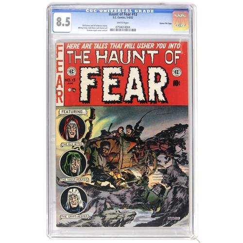 <B>Haunt of Fear #13 Gaines File pedigree 9/12 (EC, 1956) CGC VF+ 8.5 White pages.</B></I> The great page quality stands out on this issue from the closet of Bill Gaines. A Graham Ingels cover and interior art by Ingels, Jack Kamen, Johnny Craig, and Jack Davis make this a very desirable copy. Overstreet 2006 VF 8.0 value = $248; VF/NM 9.0 value = $374. CGC census 7/06: 1 in 8.5, 5 higher. <BR><BR><B>Important notice:</B> Heritage usually auctions material at the rate of 200-250 lots per hour. On some occasions eBay Live bid software or the Internet may not be able to keep up with the pace of the auction. We recommend placing a realistic absentee bid now as insurance to avoid disappointment. Occasionally the auctioneer may eliminate or reject an eBay Live bid, and the auctioneer may also reopen a lot after the close of the eBay live bidding (usually because we missed an audience bid), and may reject your bid even if it shows you as the winning bidder. By bidding via eBay Live, you agree that Heritage may award the lot to another bidder at its sole discretion under the circumstances described above or any other reasonable circumstances. Since eBay bids are not shown to us until we open the lot on the floor, we treat those bids just like floor bids. In most cases the floor responds before the eBay bid is presented to us, due to Internet lag time, so for consistency we have made it a policy that floor bids are always considered first over tie eBay live bids. Also please note that all Heritage lots purchased through eBay Live carry a 22.5% Buyer's Premium. Please make sure you read the Terms and Conditions before you bid. This lot is being auctioned in conjunction with a live floor auction by Heritage Auction Galleries. All final auction and invoice information will be supplied by Heritage Auction Galleries, and all other information should be considered preliminary. Lot:41001 <BR><BR><B>Winning Notification and Billing:</B> After the FINAL session in this auction is complete, Heritage will send e-mail and snail mail invoices. This process normally takes several days. All final auction and invoice information will be supplied by Heritage Auction Galleries, and all other information should be considered preliminary. <BR><BR>This auction will be conducted on a live auction floor and over the Internet through eBay Live. If you choose to place an absentee bid, please take a moment to <font color='#0000ff'><u><a href='http://pages.ebay.com/liveauctions/help/before/laabsentee.html'>learn how eBay Live absentee bidding works</a></u></font><font color='#000000'>