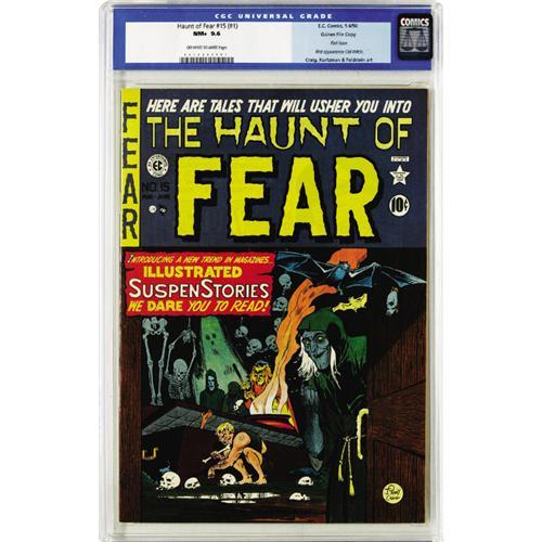 <B>Haunt of Fear #15 (#1) Gaines File pedigree 3/11 (EC, 1950) CGC NM+ 9.6 Off-white to white pages.</B></I> One month after EC's first two horror titles hit the newsstands came the premiere issue of <B>Haunt of Fear</B></I>. Fortunately for all comic collectors, publisher William Gaines put a few super-nice copies away, including this one, which ranks just a smidge behind the highest-graded copies that CGC has certified to date. Behind the Johnny Craig cover, the Old Witch makes her first appearance. Craig, Harvey Kurtzman, Harry Harrison/Wally Wood, and Al Feldstein provided the interior art. Rated "scarce" by Overstreet, this grade makes our copy almost unique. Overstreet 2006 NM- 9.2 value = $4,300. CGC census 03/06: 2 in 9.6, 2 higher.