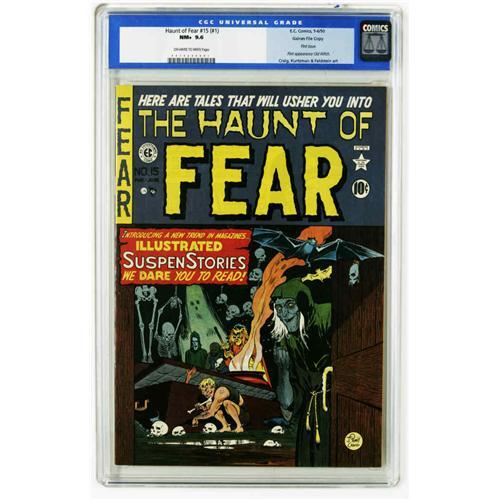 <B>Haunt of Fear #15 (#1) Gaines File pedigree 3/11 (EC, 1950) CGC NM+ 9.6 Off-white to white pages.</B></I> One month after EC's first two horror titles hit the newsstands came the premiere issue of <B>Haunt of Fear</B></I>. Fortunately for all comic collectors, publisher William Gaines put a few super-nice copies away, including this one, which ranks just a smidge behind the highest-graded copies that CGC has certified to date. Behind the Johnny Craig cover, the Old Witch makes her first appearance. Craig, Harvey Kurtzman, Harry Harrison/Wally Wood, and Al Feldstein provided the interior art. Rated "scarce" by Overstreet, this grade makes our copy almost unique. Overstreet 2005 NM- 9.2 value = $4,000. CGC census 12/05: 1 in 9.6, 2 higher.