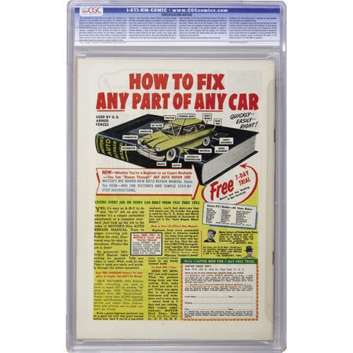 <B>Haunt of Fear #15 Gaines File pedigree 3/12 (EC, 1952) CGC NM/MT 9.8 Off-white pages.</B></I> Graham Ingels had himself to compete with in earning Overstreet "classic cover" accolades. Any number of his creations could have qualified. As for this unbelievable Gaines File Copy, one other ties it at NM/MT 9.8 certification, but there's not likely a copy that's better. Ingels, George Evans, Jack Kamen, and Jack Davis drew the interior stories. Overstreet 2006 NM- 9.2 value = $500. CGC census 10/06: 3 in 9.8, none higher.<BR><BR><b>Shipping:</b> Slabbed Comic (<a target="_blank" href="http://www.heritageauctions.com/common/shipping.php">view shipping information</a>)