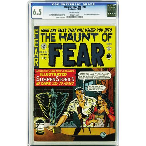 <B>Haunt of Fear #16 (#2) (EC, 1950) CGC FN+ 6.5 Off-white pages.</B></I> Notable for the first appearance of the old Witch, this issue has a Johnny Craig cover, with interior art by Craig, Graham Ingels, Jack Kamen, and the team of Wally Wood and Harry Harrison. Overstreet 2006 FN 6.0 value = $354; VF 8.0 value = $915. CGC census 3/06: 1 in 6.5, 9 higher.